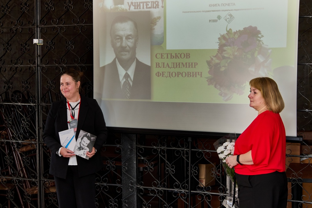 Каждого представителя лично представили деканы факультетов. Директор вуза Татьяна Валерьевна Жуйкова всем подарила добрые слова, цветы, памятную статуэтку «Лучший Учитель» и Свидетельство о внесении кандидата в Книгу Почета – 2024. Особенно трепетно было слышать слова благодарности от ветеранов – Нины Борисовны Вернигор, Антонины Александровны Тутубалиной, Валентины Ивановны Коноваловой. К сожалению, некоторых преподавателей уже нет в живых, но жива Память о них и их труде. О своем отце, Владимире Федоровиче Сетькове, добрые слова сказали его дочери. Слова благодарности тем, кто увековечивает память о сотрудниках института, прозвучали из уст родных и близких.