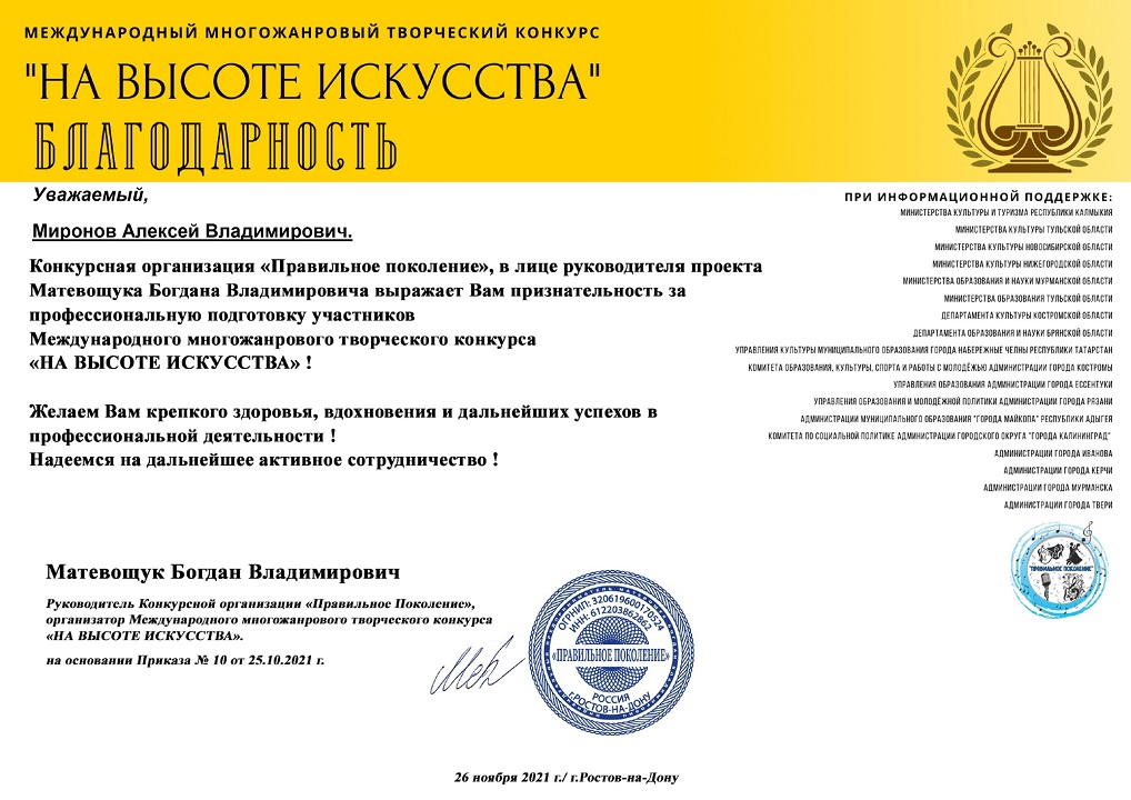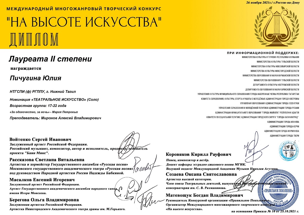 Юлия Пичугина – лауреат II степени Международного многожанрового творческого конкурса «На высоте искусства»