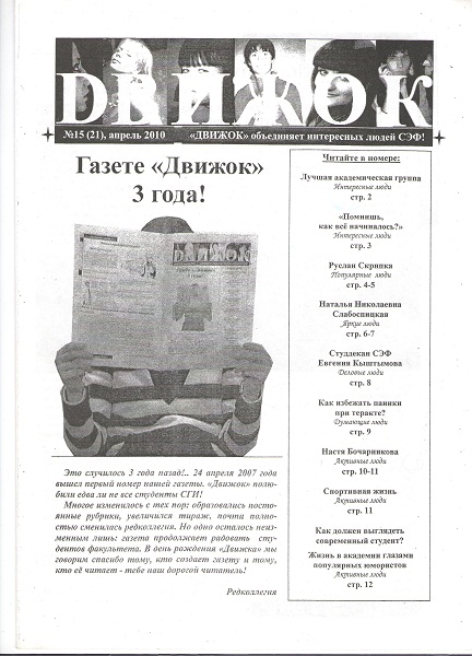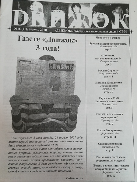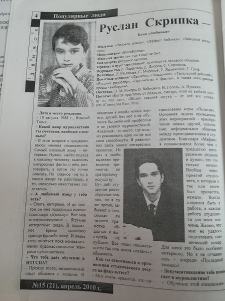 Как отмечал Руслан Скрипка, «главное верить в себя и не бояться делать то, что тебе интересно. На втором курсе я понял, что есть вузовская «большая» газета «Академия», а ребятам хотелось выпускать свою, факультетскую «малотиражку». И я пошел к ректору и сказал: «Хотим»! И нам дали такую возможность! На факультете появилась газета «Движок», в которой все, кто хотел и мог писать, получили возможность высказаться, написать, поделиться».