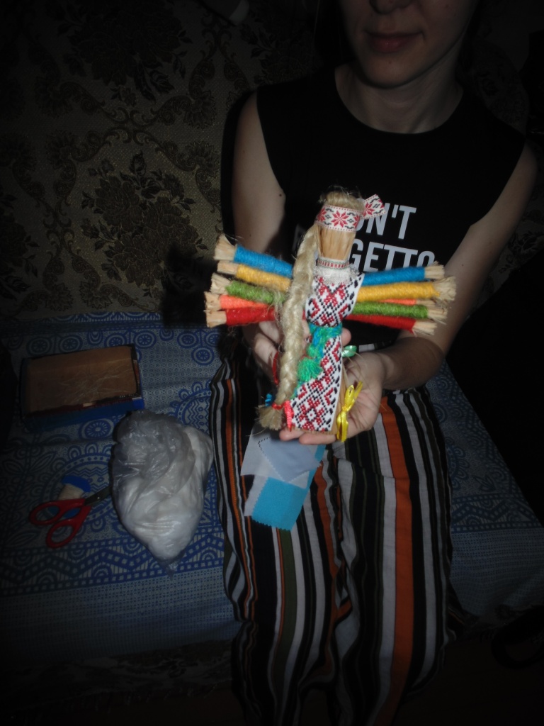 Влада Логиновских: «Еще никогда не было необходимости носить с собой блокнот, а тут практика. Помню, что ходила по улицам и записывала всех, кого слышала, а на праздниках за столом у меня всегда был с собой блокнотик, чтобы ничего не упустить. Никогда не пользовалась так часто диктофоном на телефоне, именно он выручил меня на практике. Я услышала много интересных историй, но особенно мне запомнилась встреча с женщиной, которая сама делает куклы-обереги. Она рассказывала о куклах так, будто это ее дети или родные. Я поняла, что она вкладывает свою душу в каждую куклу, наверное, поэтому они помогают людям».