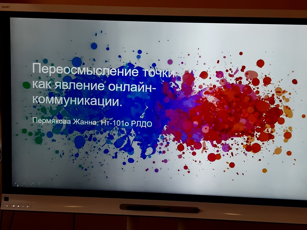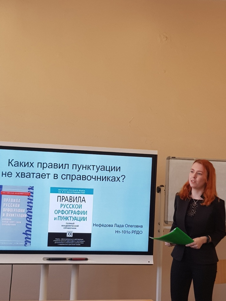 О структуре современной пунктуационной системы, включающей не только традиционные знаки препинания, но и некоторые средства графической организации текста, такие, как абзац, различные шрифтовые написания и даже смайлики, рассказала Варвара Волкова. Лада Нефёдова подняла вопрос о том, каких правил не хватает в современных справочниках по пунктуации. Александра Казаринова рассказала об особенностях функционирования чужой речи в интернет-коммуникации. Жанна Пермякова подтвердила мысли студентов – активной аудитории соцсетей – о том, что в онлайн-коммуникации точка как знак конца предложения утрачивает традиционную функцию членения текста и приобретает новое значение: точка в конце предложения в переписке в соцсетях воспринимается как сигнал недружелюбного отношения отправителя к получателю. Вот те проблемы, которые вызвали живой профессиональный интерес у участников научно-практической конференции.