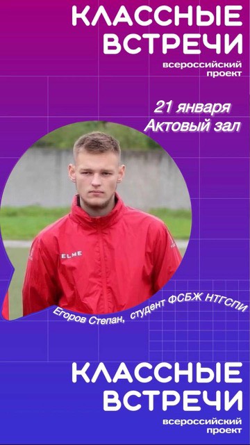Встреча учеников 8–10-х классов с выпускниками школы – студентами педагогических вузов и колледжей нашего города прошла в МБОУ СОШ № 90. В ней принял участие студент 1 курса факультета спорта и безопасности жизнедеятельности НТГСПИ Егор Степанов. После окончания МБОУ СОШ № 90 он поступил на ФСБЖ и обучается на СПО по направлению подготовки «Физическая культура».