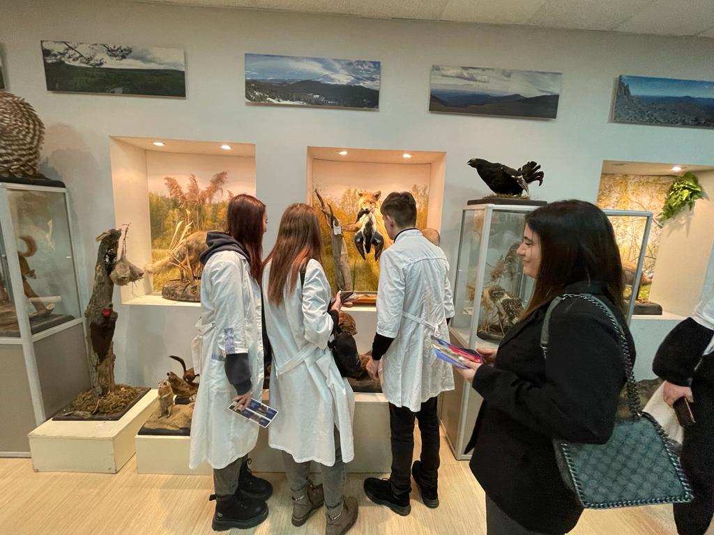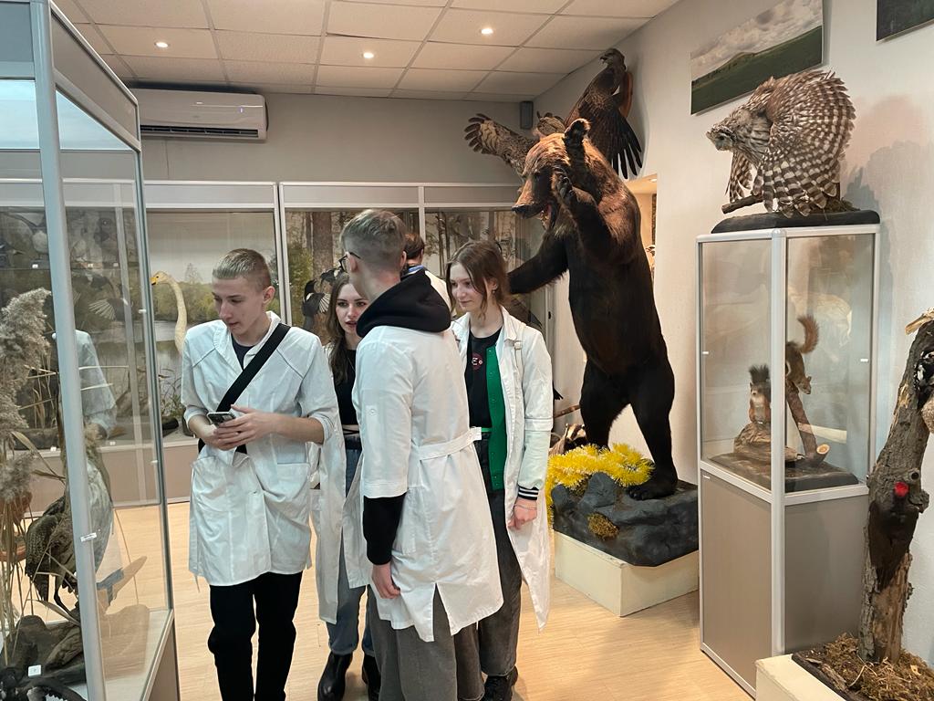 Огромный интерес у ребят вызвала экскурсия по химическим и биологическим лабораториям. Включились в работу органы чувств – все хотелось потрогать, понюхать, заглянуть внутрь. Но не все это можно было делать. Сразу видно, что перед нами не просто школьники, а юные естествоиспытатели! В кабинетах химии они с интересом рассматривали химические формулы на доске, надписи на пузырьках с химическими реактивами, заглянули в вытяжные шкафы. В кабинете зоологии чуть не прижались к горному козлу, который в 3,5 раза старше их, рассмотрели влажные препараты лягушек, змей, ящериц. В музее природы фотографировались около чучела медведя и радовались, что правильно определили выдру (не понятно почему именно ее).