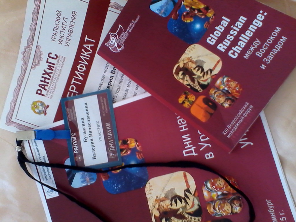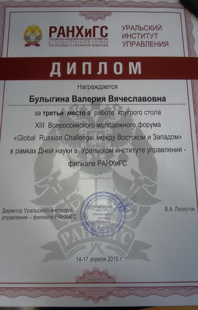 В рамках XIII Всероссийского молодежного форума «Global Russian Challenge: между Востоком и Западом» состоялась работа тематических круглых столов, где каждый участник получил возможность выступить с докладом по выбранной теме и обсудить ее с коллегами из других вузов и присутствующими экспертами. Участники нашей команды заняли третьи места в следующих секциях: