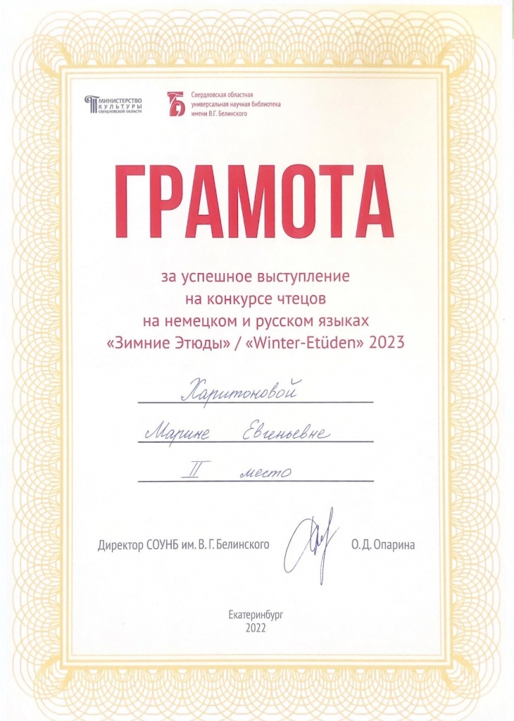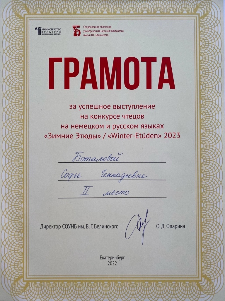 5 января в библиотеке им. В. Г. Белинского (г. Екатеринбург, ул. Белинского,15) состоялся конкурс чтецов на немецком языке. Зимний конкурс чтецов в этом году был довольно необычный: участники не просто состязались в декламации наизусть стихотворения на немецком языке на зимнюю тематику, но каждый участник должен был также прочитать наизусть перевод этого стихотворения на русский язык. Допускалось представление своего собственного перевода стихотворения на русский язык. Время выступления одного участника не должно было превышать четырех минут. Использование дополнительных аудиовизуальных средств не допускалось. В конкурсе приняли участие школьники старших классов и студенты образовательных учреждений Свердловской области и Уральского региона, а также взрослые.