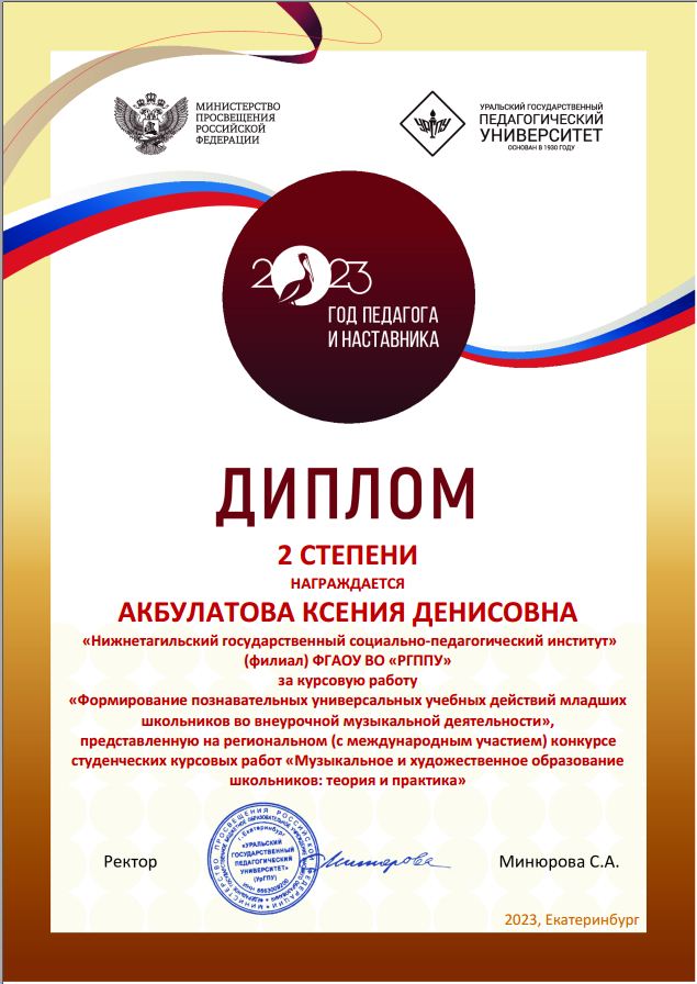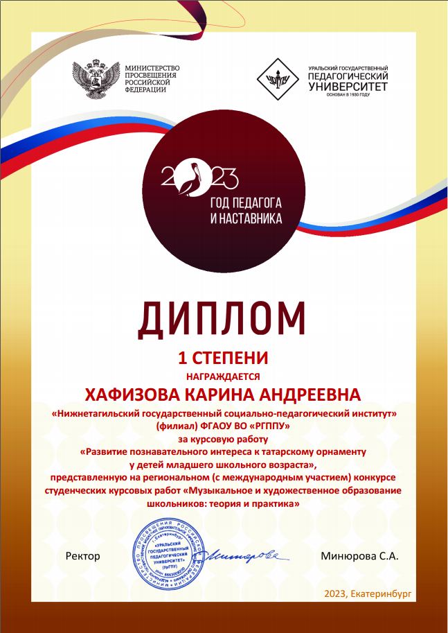Студенты факультета психолого-педагогического образования группы Нт-504о НДО приняли участие в конкурсе студенческих курсовых работ «Музыкальное и художественное образование школьников: теория и практика». Во второй тур вышли и публично представили свою научную работу в рамках онлайн-сессии Карина Хафизова с курсовой работой по теме «Развитие познавательного интереса к татарскому орнаменту у детей младшего школьного возраста» и Ксения Акбулатова с работой «Формирование познавательных универсальных учебных действий младших школьников во внеурочной музыкальной деятельности». Были подведены итоги конкурса. Карина Хафизова заняла первое место в номинации «Художественное образование», научный руководитель – Ирина Борисовна Ческидова; Ксения Акбулатова заняла второе место в номинации «Музыкальное образование», научный руководитель –Елена Давидовна. Трофимова.