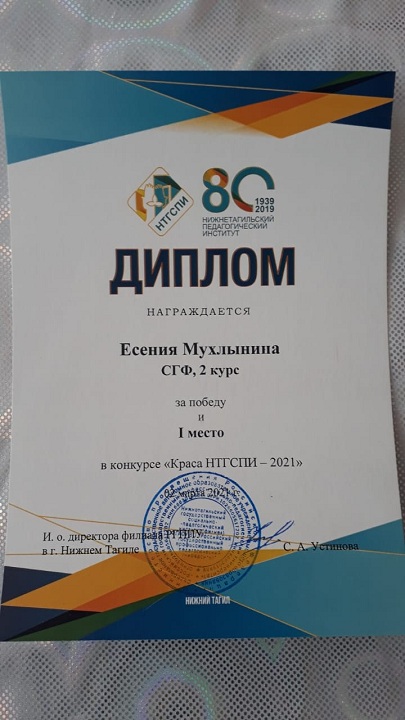 1 место и звание «Краса НТГСПИ – 2021» – студентка СГФ Есения Мухлынина.
