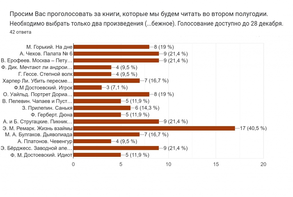 Определился перечень книг для чтения и обсуждения во втором полугодии 2022–23 уч. года. Постоянные участники клуба и сочувствующие проголосовали за отечественное и зарубежное произведения. Результаты вы можете видеть в диаграммах. Итак, читаем и обсуждаем тексты в следующем порядке: