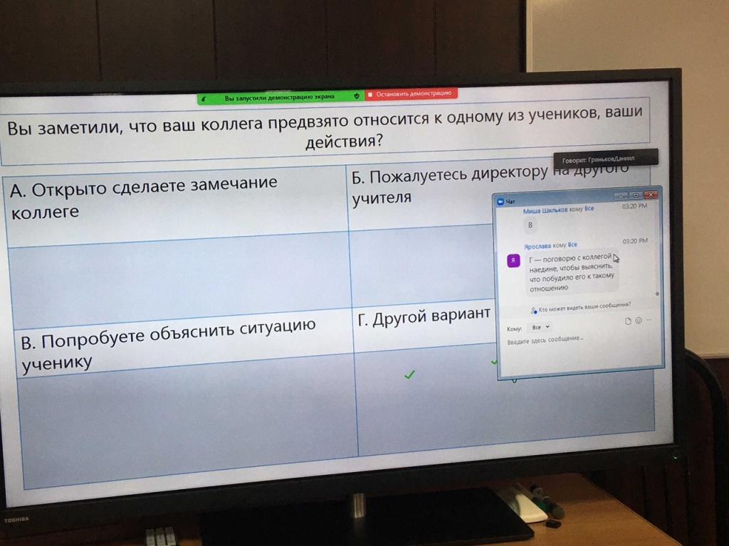Активное обсуждение педагогических ситуаций происходило и через чат Zoom-конференции. Таким образом, была возможность интерактивно голосовать и вести два диалога об одном фильме с богатой проблематикой.
