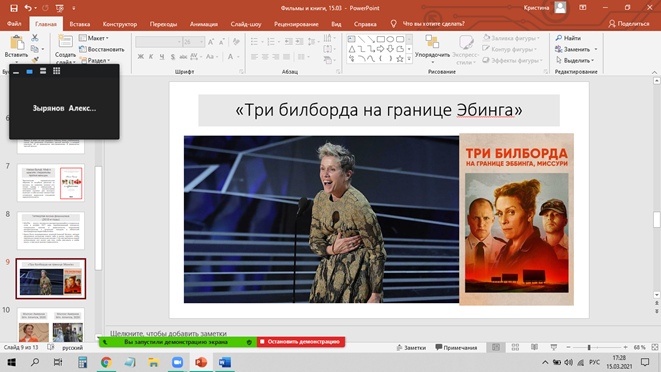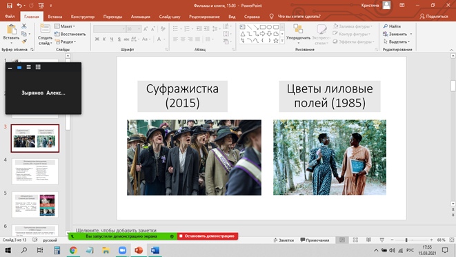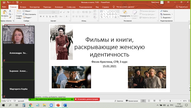 15 марта 2021 г. в рамках Дней науки в филиале РГППУ в г. Нижнем Тагиле на платформе Zoom состоялся круглый стол «Книги и фильмы, раскрывающие женскую идентичность», в котором приняли участие 10 студентов. В роли модератора выступила Кристина Фесик – студентка 3-го курса социально-гуманитарного факультета.
