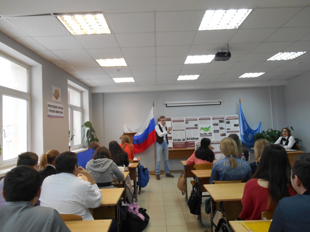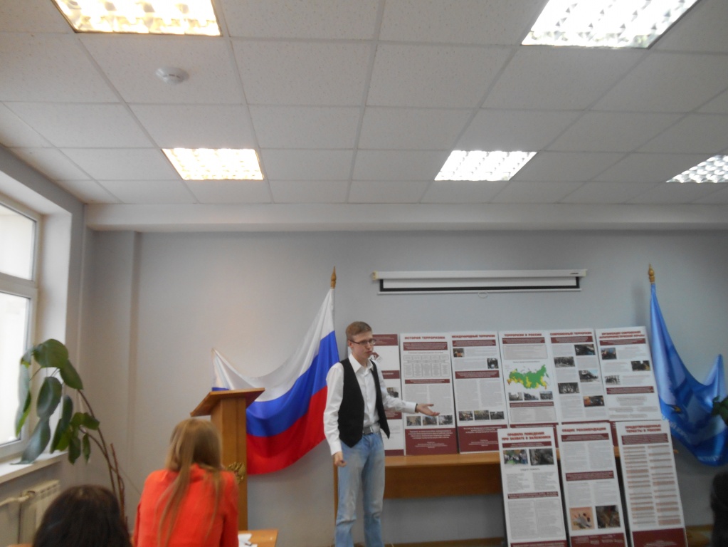 Далее на пленарном заседании выступил студент 3 курса социально-гуманитарного факультета Михаил Дягилев, который презентовал передвижную выставку «Терроризм – угроза мировому порядку», подготовленную студентами СГФ, ФСБЖ и ФФМК.