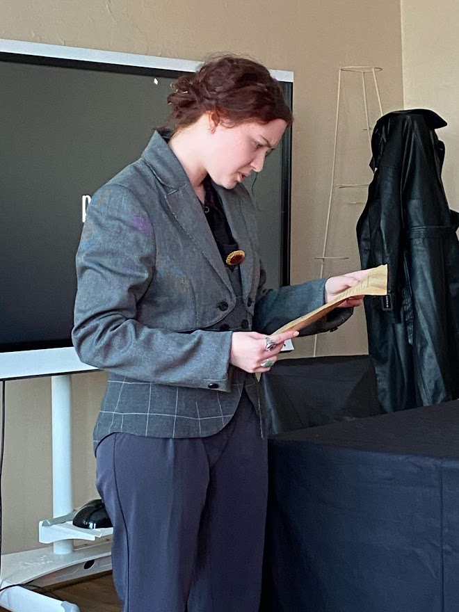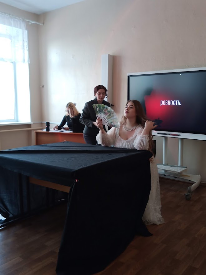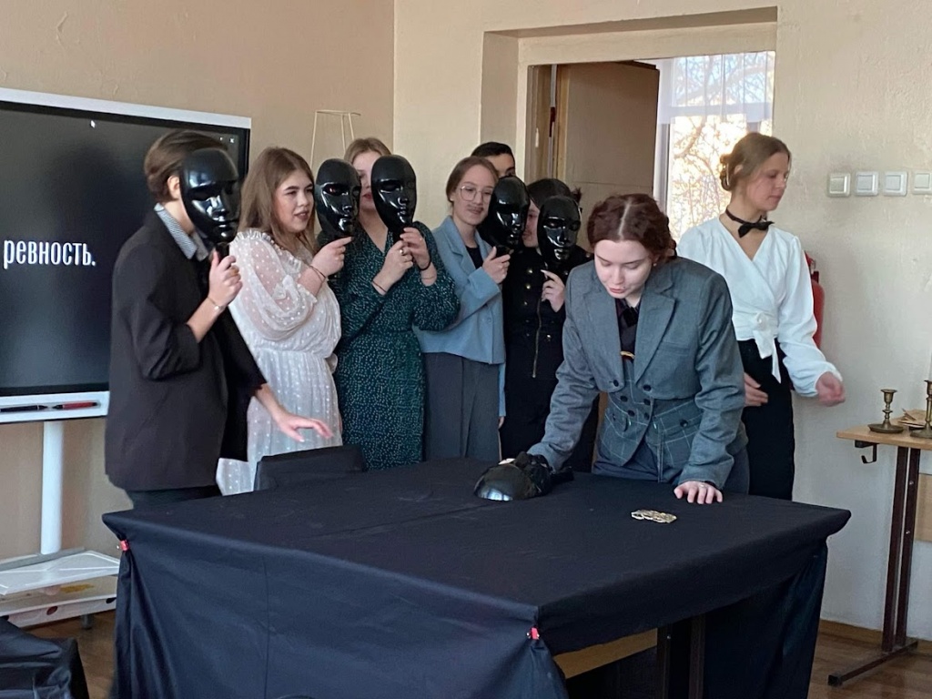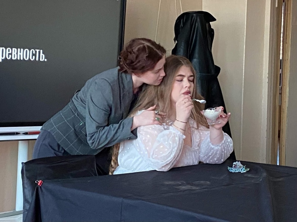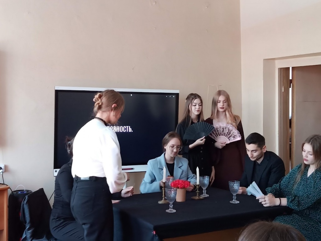 Вечер завершился драмой «Маскарад» в исполнении студентов 3 курса. Каждый из участников вложил в свою роль частичку души, чтобы передать зрителям всю гамму эмоций и переживаний героев. Особое восхищение вызвала игра Александры Казариновой. Она сумела раскрыть всю сложность образа главного героя Евгения Арбенина. Александра буквально слилась с персонажем, а ее реплики вызвали у зрителей эмоциональный отклик. Приятно удивила и Яна Шиндяпина в роли Неизвестного. Ей удалось убедительно перевоплотиться в своего персонажа и прожить его жизнь на сцене. Также стоит отметить Елизавету Пятыгину в роли Нины.