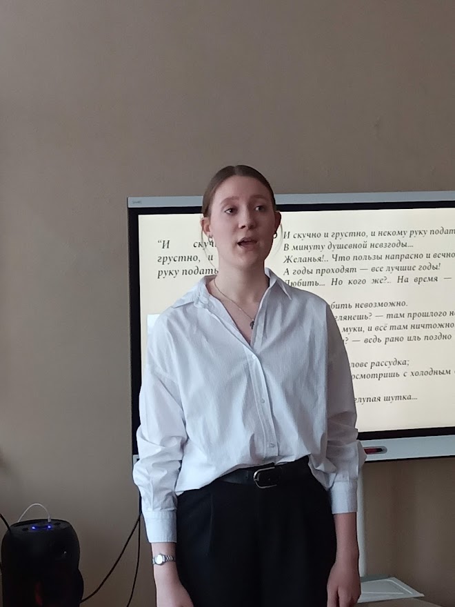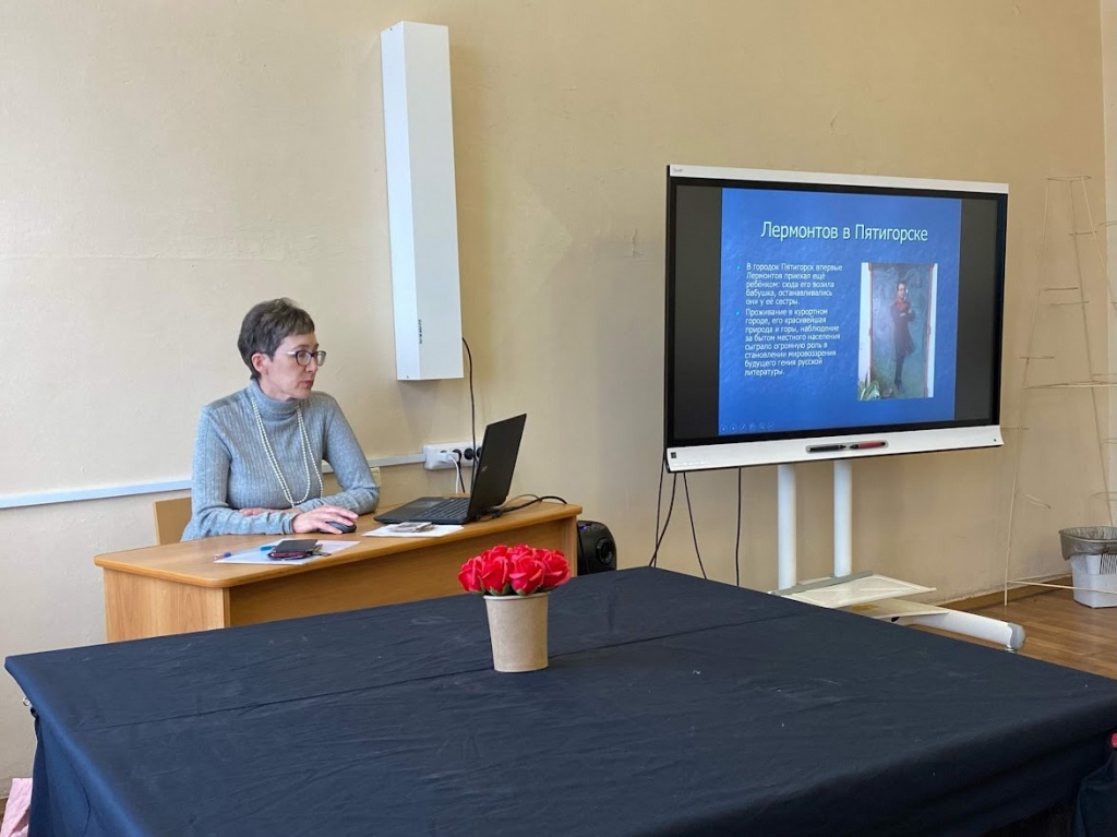 Рассказ дополнила доцент кафедры ИЯРФ Галина Анатольевна Авдеева. Она рассказала о своих поездках по лермонтовским местам в Пятигорске и Кисловодске в 2023–2024 гг., проиллюстрировав сообщение собственными фотографиями. Особое внимание было уделено месту дуэли Лермонтова и Мартынова. Галина Анатольевна также представила великолепный видеоролик (минифильм) о поездке в Тарханы, который был выполнен Е. В. Урумашвили, выпускницей НТГСПИ, проработавшей несколько лет в пединституте и сейчас продолжающей сотрудничество с вузом в качестве учителя-консультанта для студентов во время педпрактики.