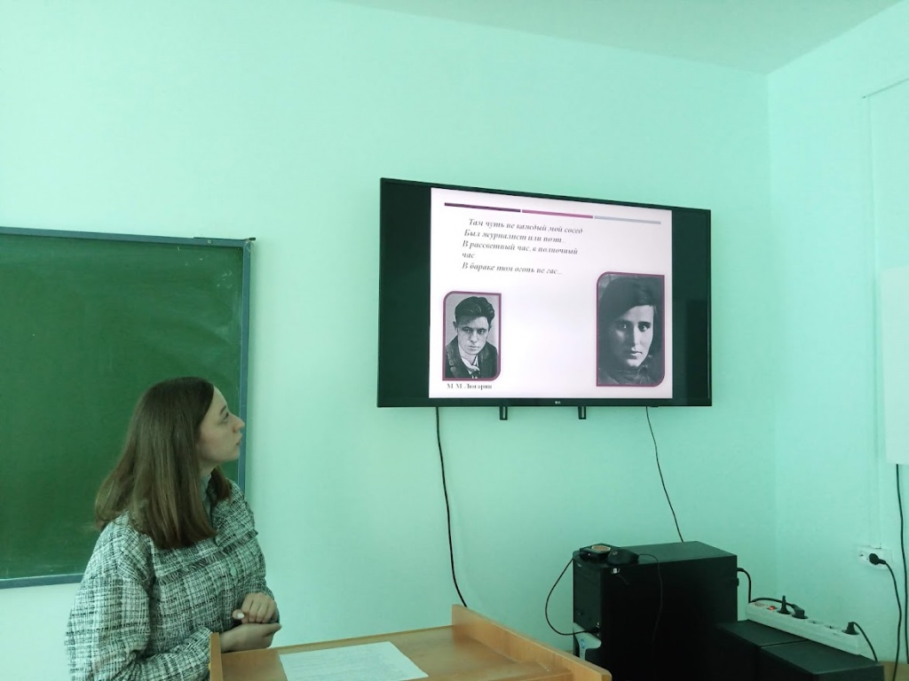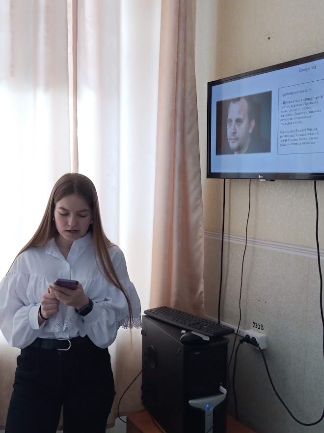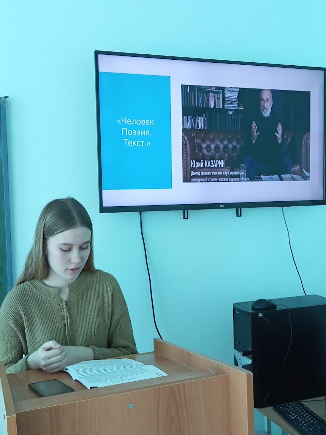 И на этот раз студенты самостоятельно выбирали авторов. Прозвучали сообщения о поэтах разных поколений: о Юрии Сергеевиче Трофимове, Людмиле Константиновне Татьяничевой, Майе Петровне Никулиной, Алексее Леонидовиче Решетове, Аркадии Валерьевиче Застырце, Юрии Викторовиче Казарине, Олеге Дозморове, Алексее Сальникове, Борисе Рыжем и других авторах.