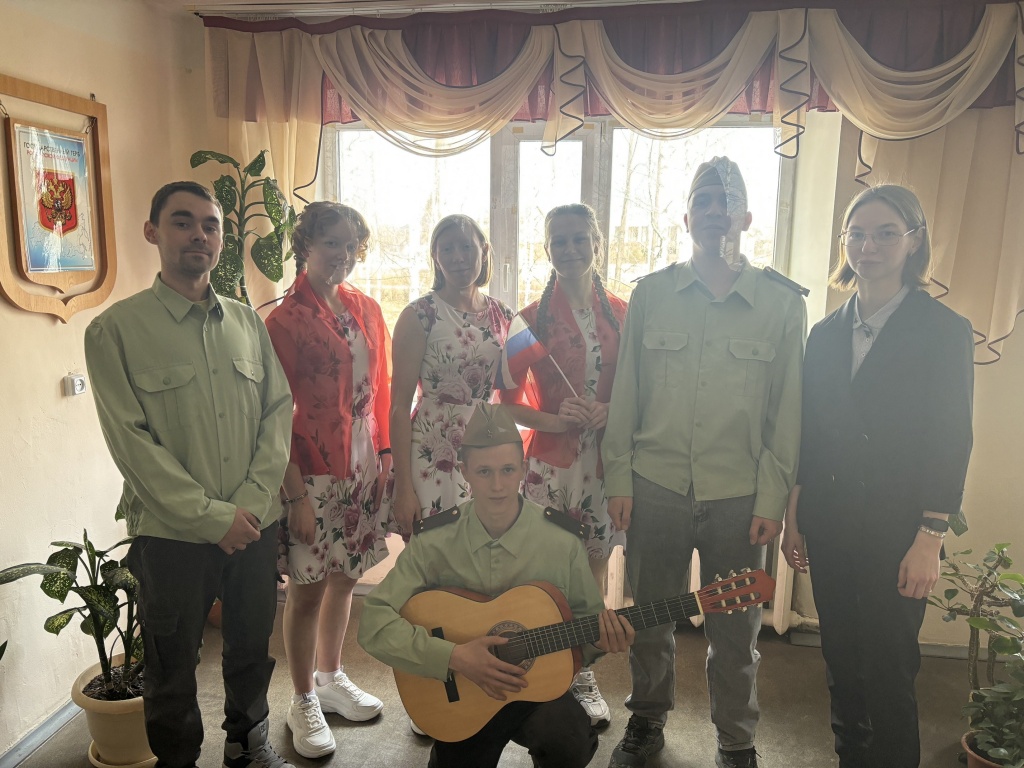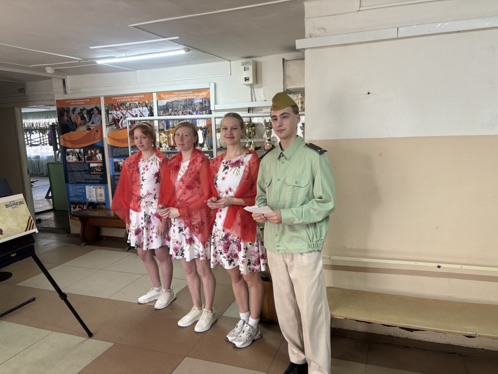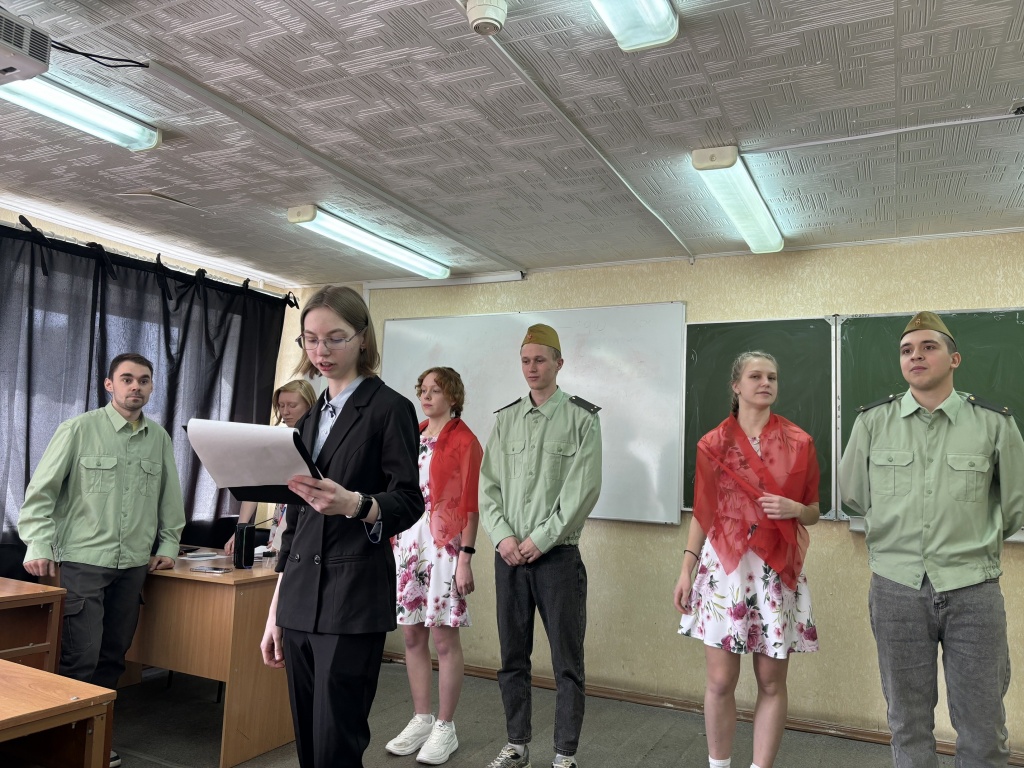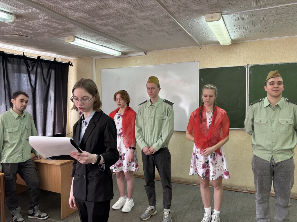 В честь этого праздника мы собрались в литературно-музыкальной гостиной, что почтить память о великих подвигах наших прадедов и дедов. Студенты: Лемницкая Александра, Смирнова Валерия, Окулова Ирина, Арлаускас Александр, Поляков Александр –подготовили музыкальные, хореографические номера, а также прочитали произведения, посвященные героям Великой Отечественной воны. Стихи военного времени и песни, прозвучавшие на мероприятии, оказали неизгладимое впечатление на студентов.