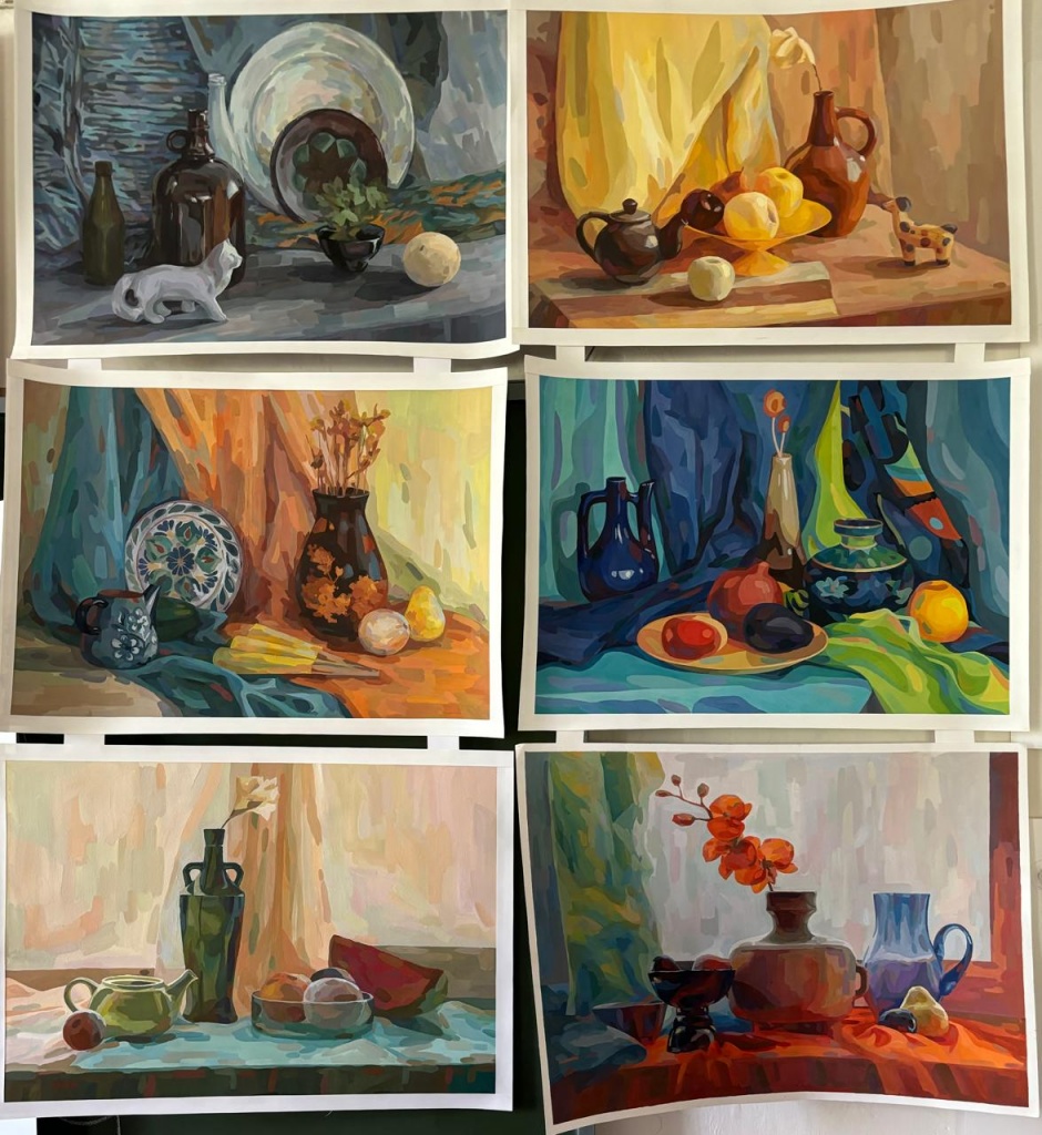 В этом году выставка «Лучшие учебно-творческие работы» представлена живописными холстами студентов 1, 3 и 5 курсов. А вот работы в технике мозаики и печатной графики мы представим отдельными экспозициями!