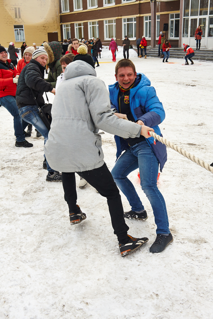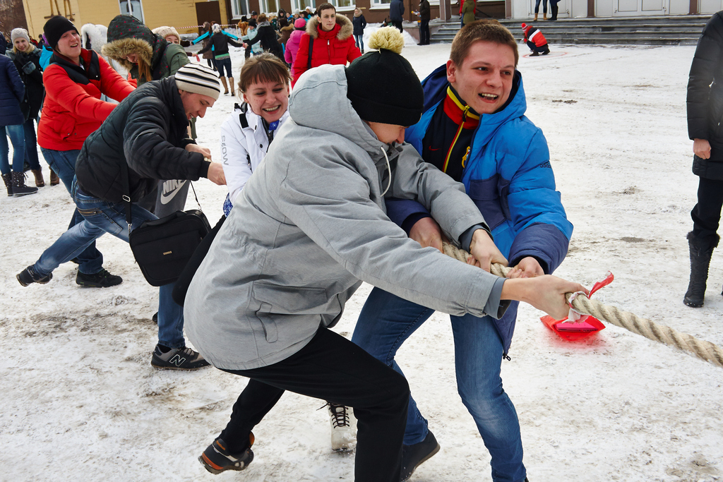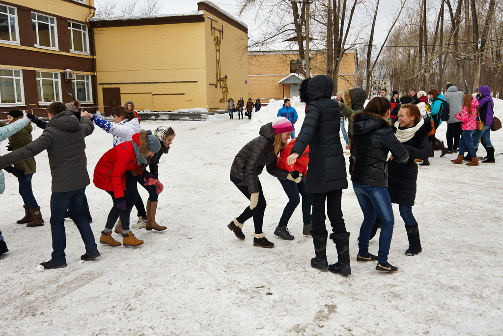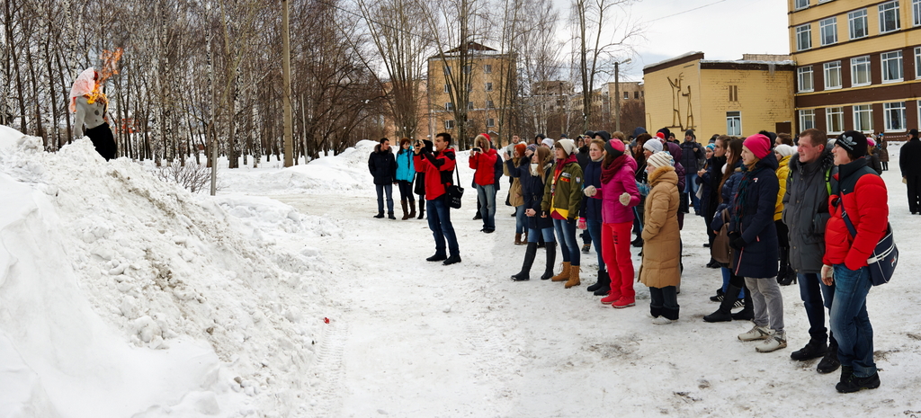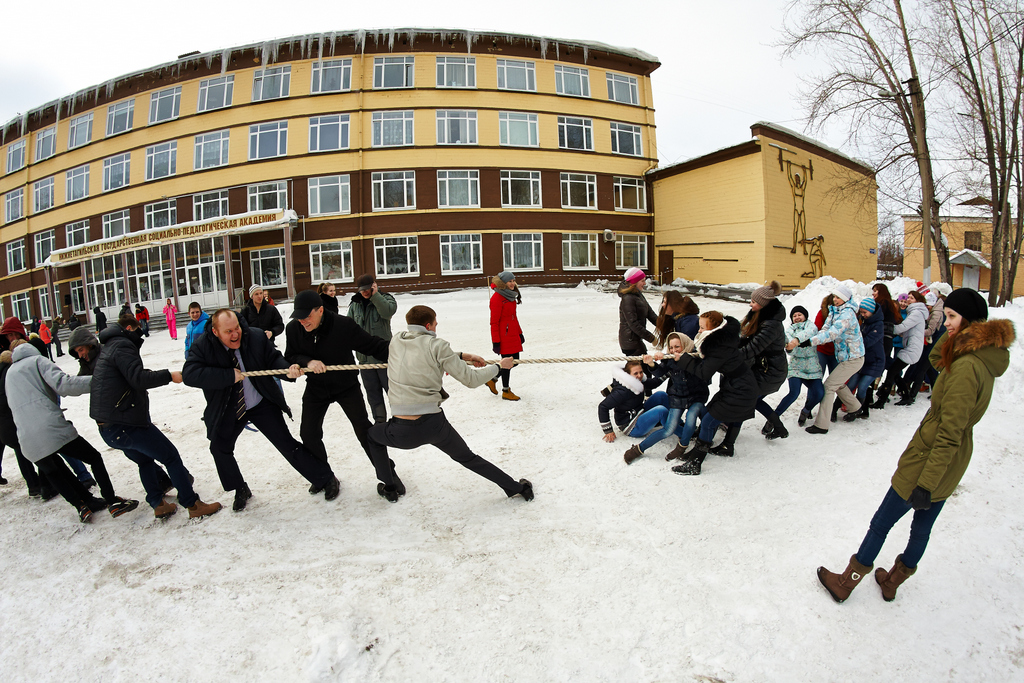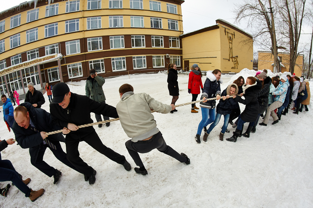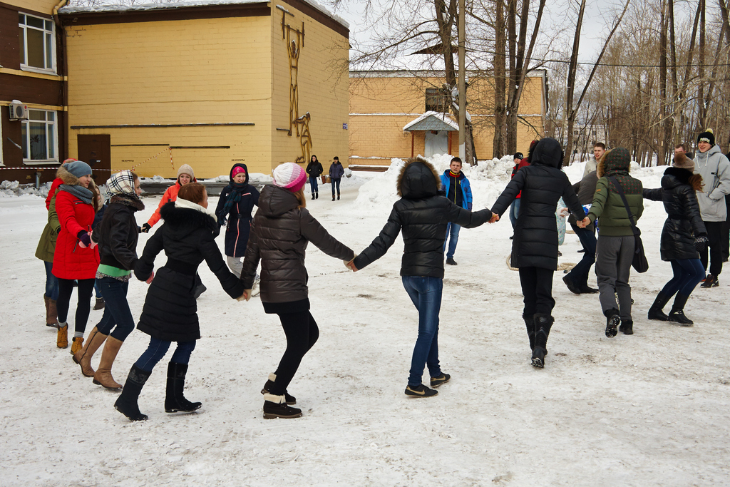 Факультеты приготовили самые разнообразные масленичные забавы: взятие крепости, перетягивание каната, игра в снежки, вождение хоровода, игры в вышибалы, фотографирование с Масленицей.