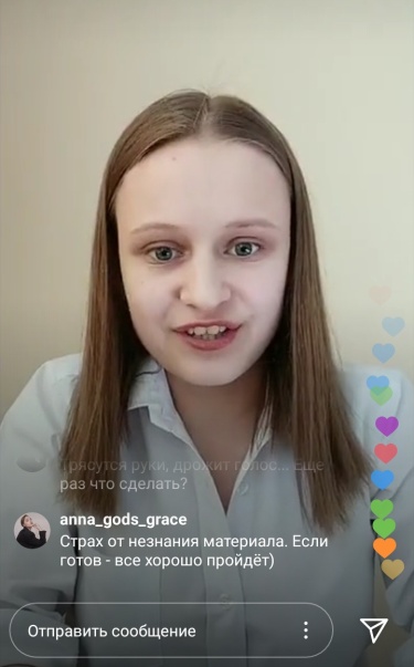 В прекрасный солнечный день студенты встретились в прямом эфире Instagram-аккаунта и обсудили важную тему. Ксения рассказала об источниках страха и подробно изложила, что нужно сделать для того, чтобы избавиться от них.