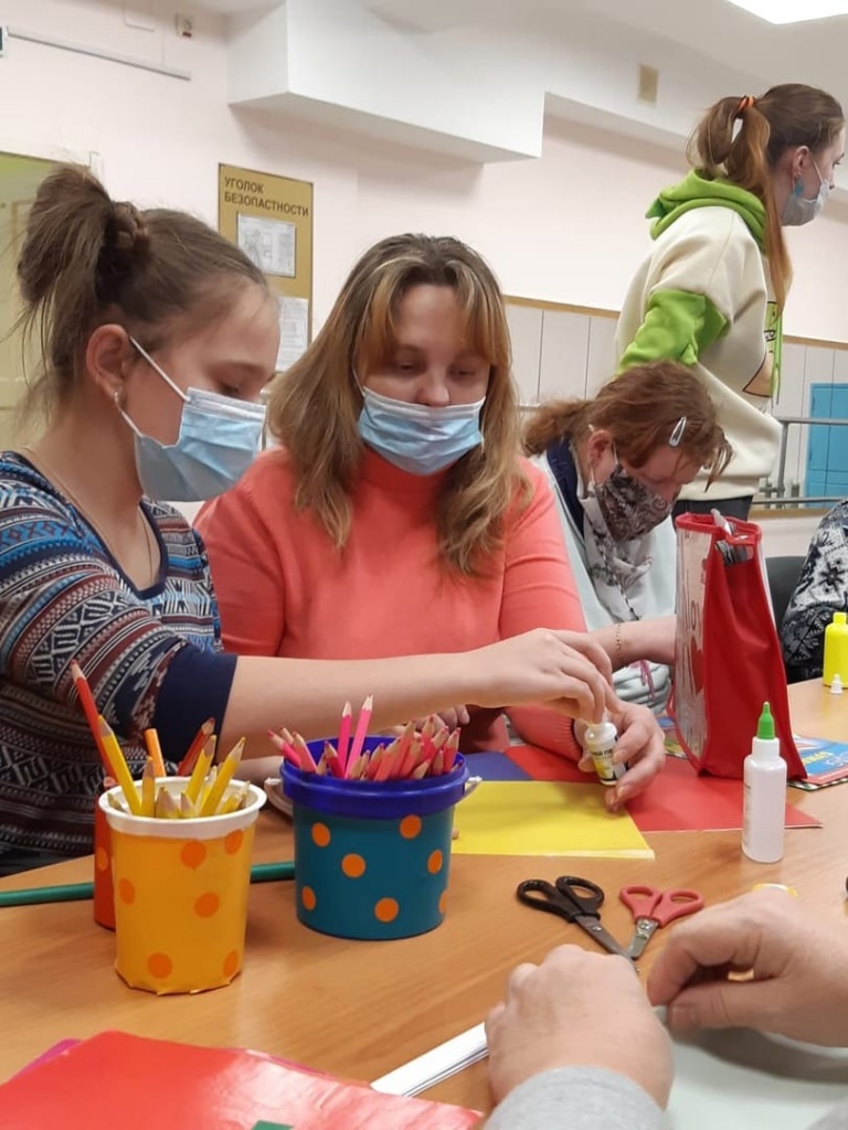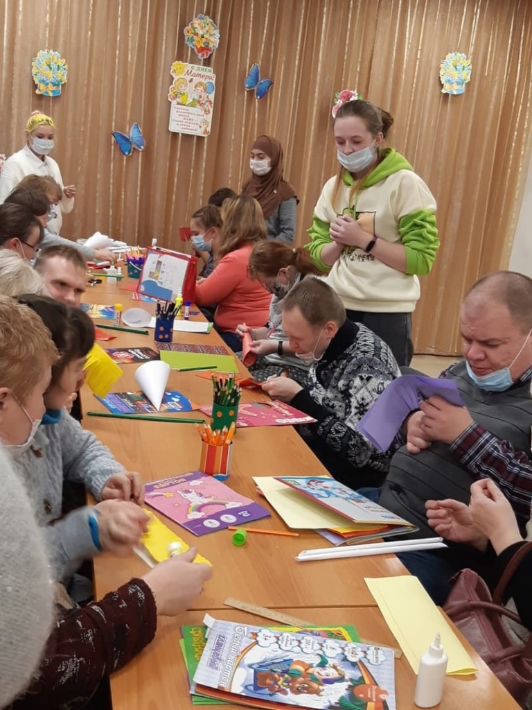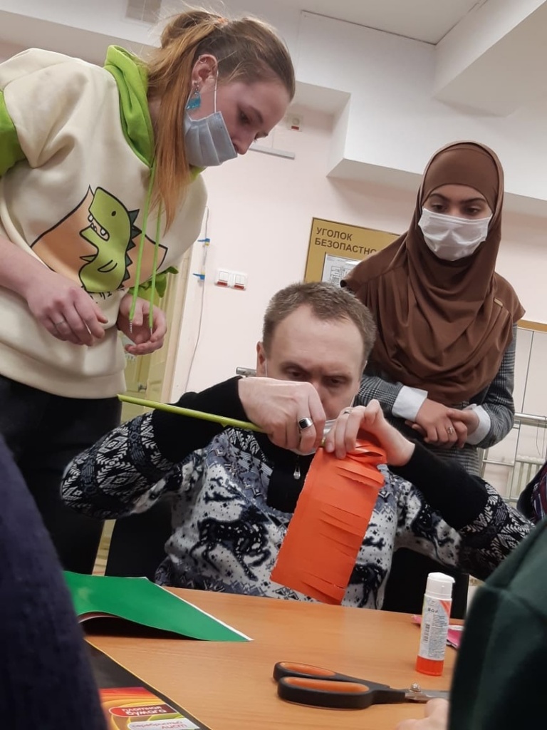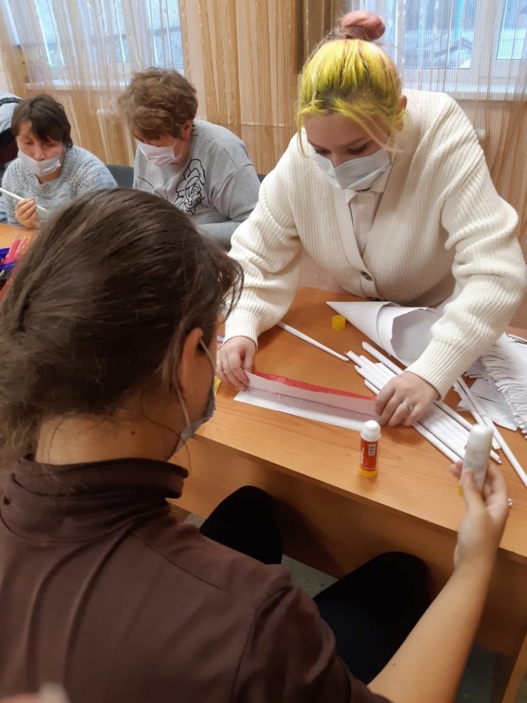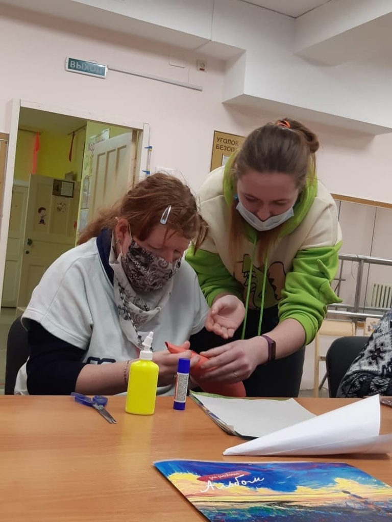 Люди с ограниченными возможностями здоровья вместе с волонтерами занимались увлекательной арт-терапией. При помощи клея, цветной бумаги, а главное – своей креативности участники создали очень красивые букеты. Волонтеры получили много положительных эмоций от проведения данного мастер-класса. Студенты рады, что их внимание и забота сделали других немного счастливее.