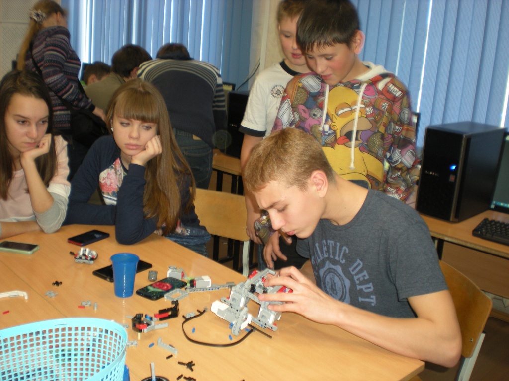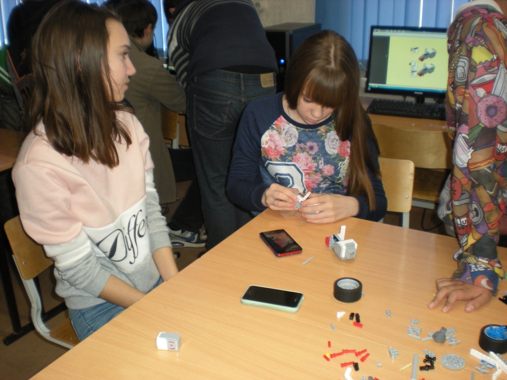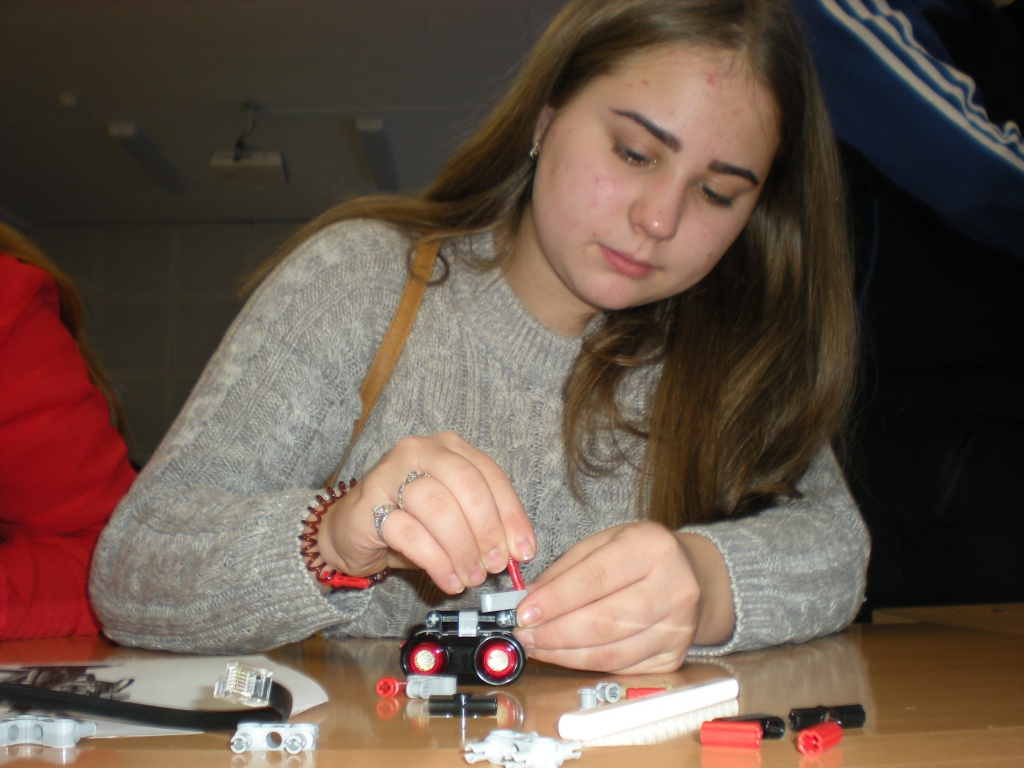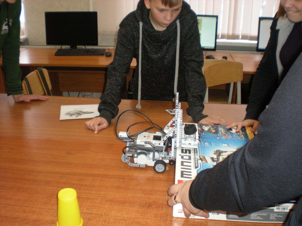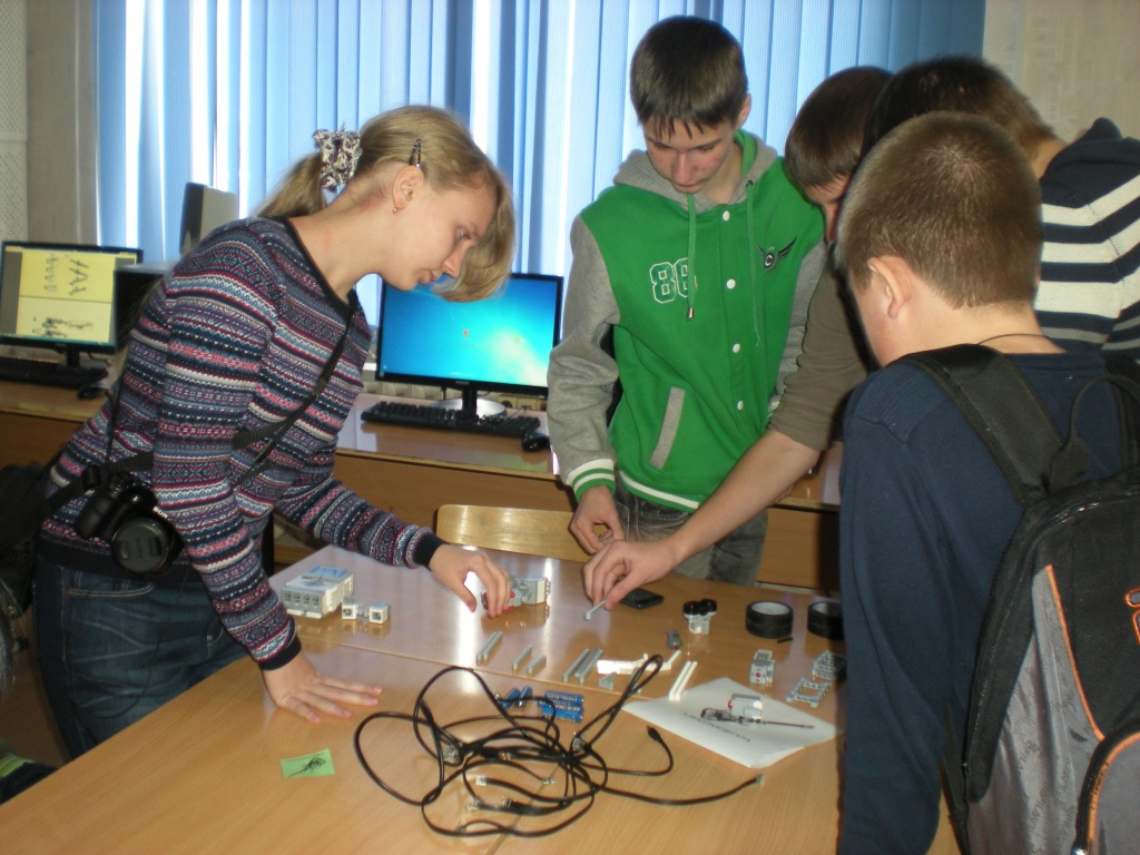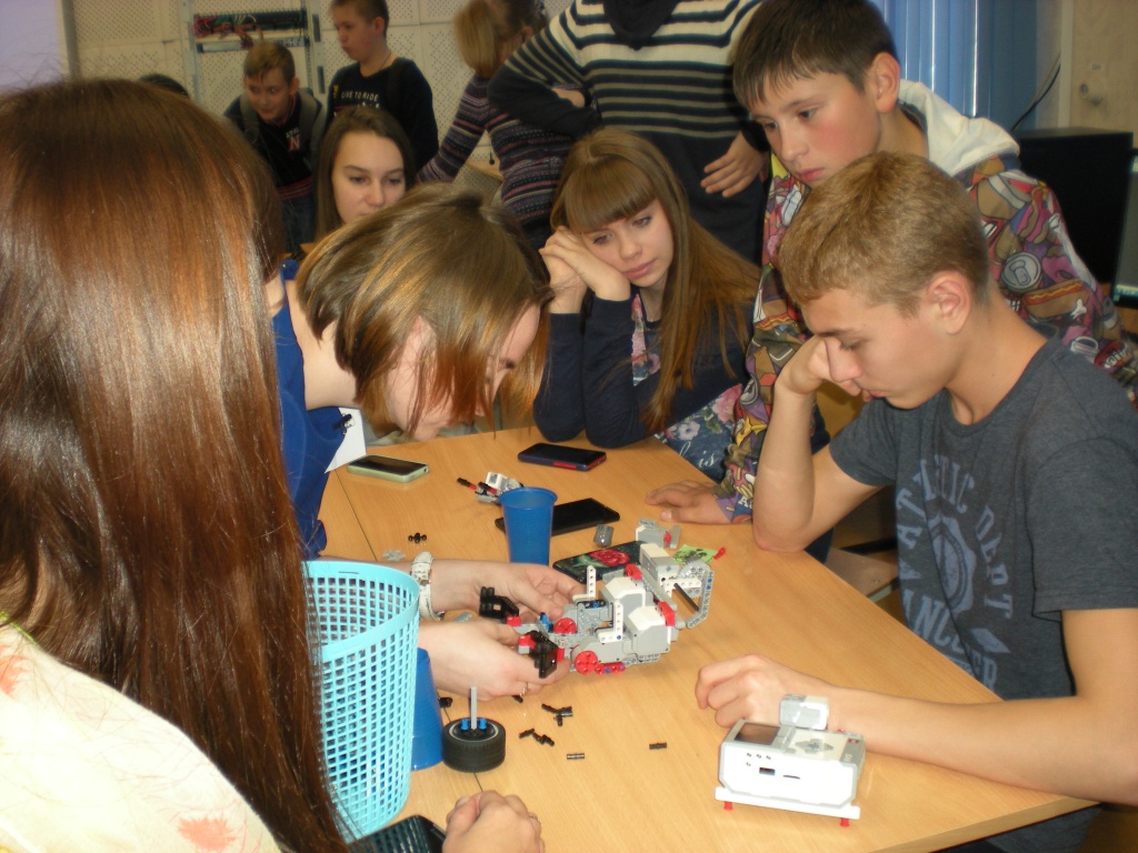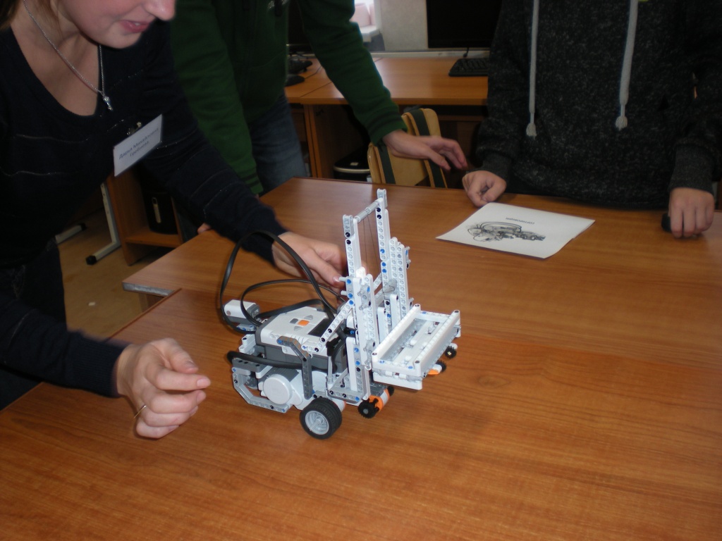 Затем ребята, разделившись на команды, принялись за дело. 5 команд очень увлеченно совместно со студентами 4 курса собирали и программировали «робота-клешню» и «робота-погрузчика». Целый час тяжелой работы прошел не зря. 3 робота были собраны в срок и работали без ошибок. Две команды убедились на практике, что от качества сборки очень зависит работоспособность технических устройств.
