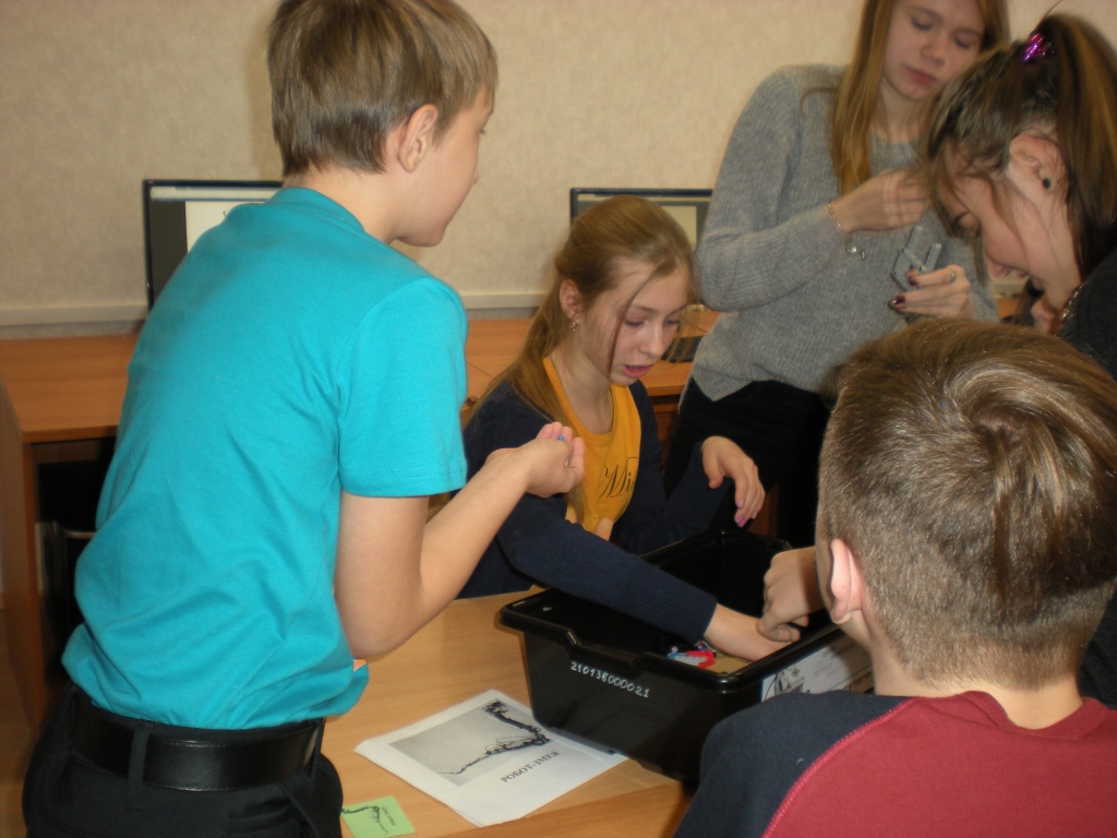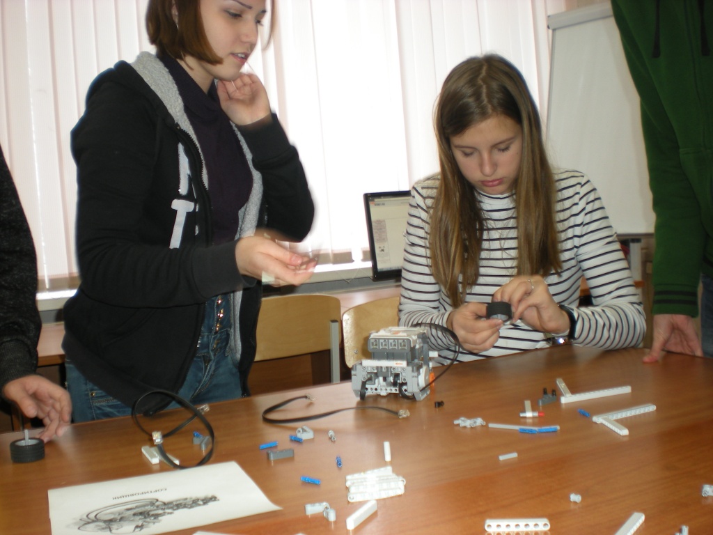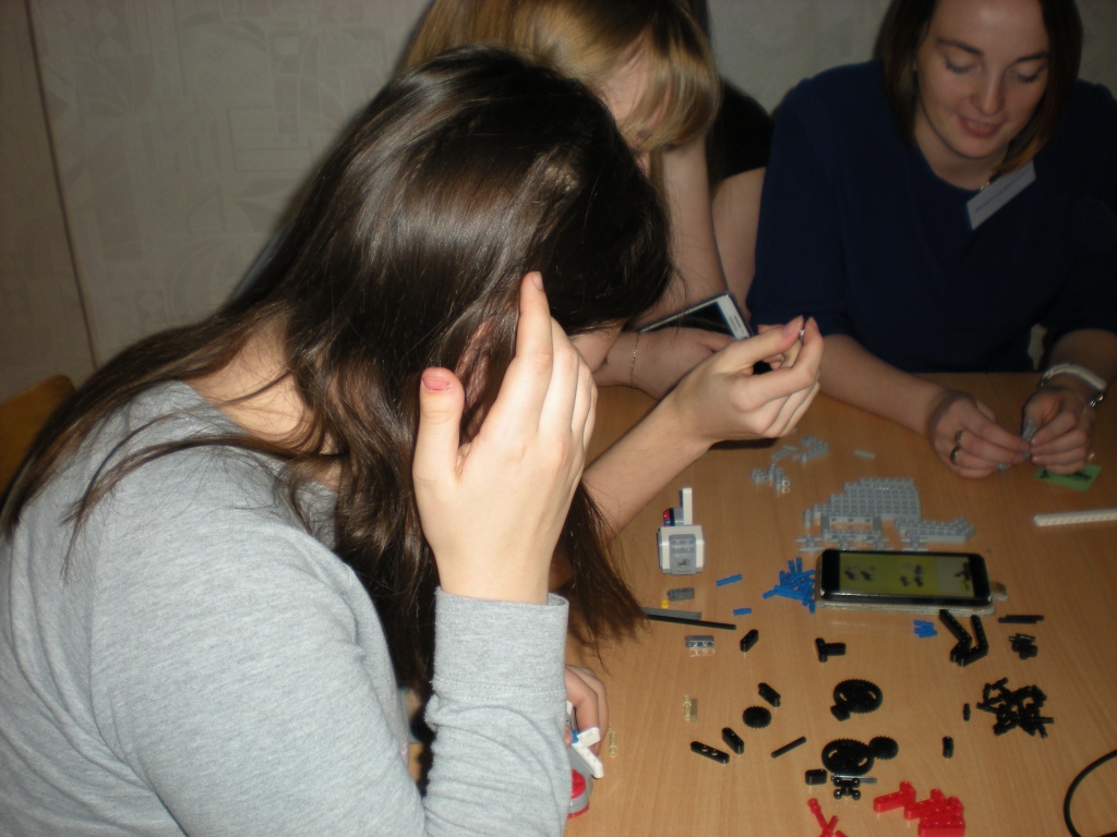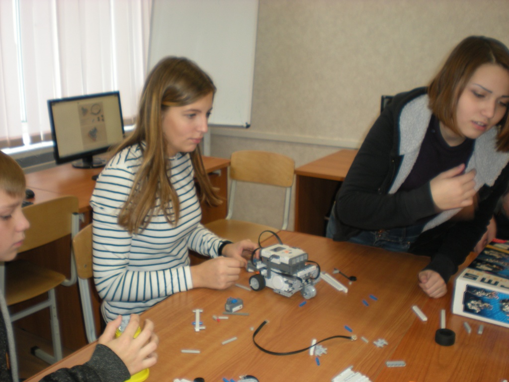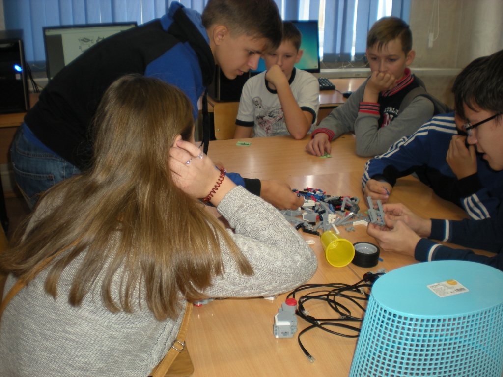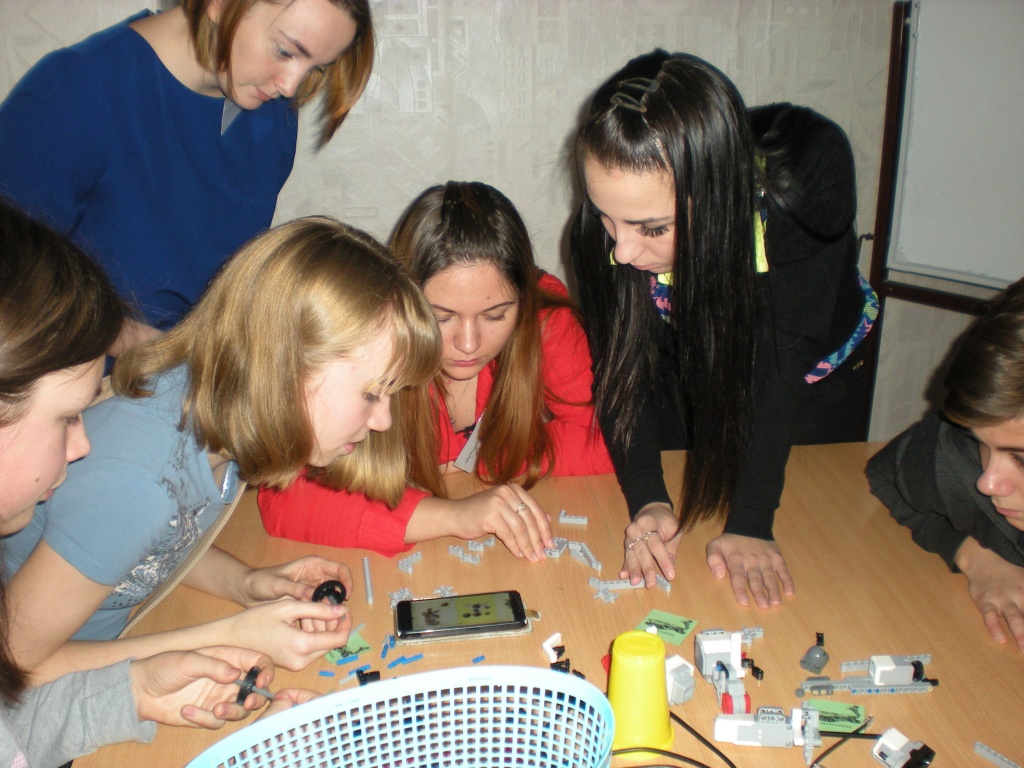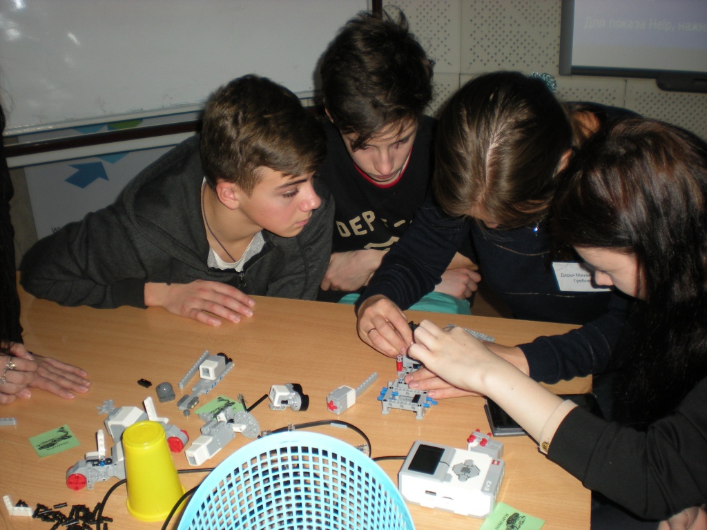 Затем ребята, разделившись на команды, принялись за дело. 5 команд очень увлеченно совместно со студентами 4 курса собирали и программировали «робота-клешню» и «робота-погрузчика». Целый час тяжелой работы прошел не зря. 3 робота были собраны в срок и работали без ошибок. Две команды убедились на практике, что от качества сборки очень зависит работоспособность технических устройств.