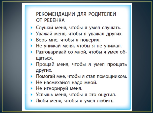 В ходе мастер-класса выяснилось, что на пути к совершенствованию детско-родительских отношений важно осознать свою роль как родителя в становлении личности ребенка на эмоционально-смысловом уровне. Для этого выполнили упражнение «Река и берега». Для определения представлений о себе в роли родителей и определения ожиданий в отношении личности детей может помочь упражнение «Мы – родители». Пришли к выводу, что начинать совершенствование детско-родительских отношений необходимо, прежде всего, с осознания себя в роли родителя.