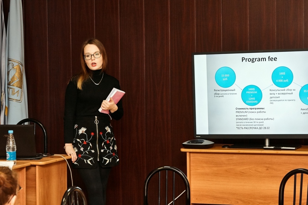 Второй мастер-класс состоялся буквально через несколько дней и был посвящен теме путешествий, международных обменов и возможности подработки за рубежом. Его ведущей стала Алина Рочева, студентка 1 курса ФФМК. Сама Алина – амбассадор компании Star Travel, занимающейся отправлением студентов на зарубежные языковые курсы, помощью при поступлении на среднее и высшее образование за рубежом, а также программой обмена WORK&TRAVEL.