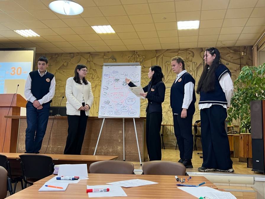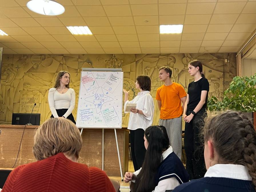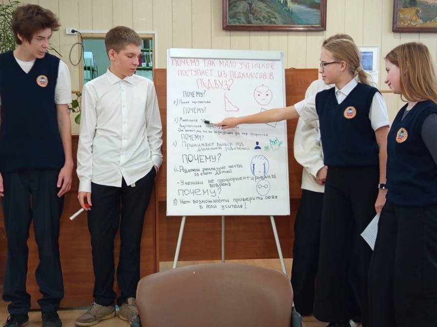 Познакомиться с идеями и рассуждениями участников мастерской удалось не только команде педагогической мастерской (студентам и преподавателям вуза), но и директору НТГСПИ, доктору биологических наук, профессору Татьяне Валерьевне Жуйковой. Как опытный педагог и руководитель педагогического вуза, Татьяна Валерьевна и сама погружена в изучение существующих проблем набора мотивированной молодежи на педагогические специальности. Под ее руководством проводится широкомасштабная компания по повышению престижа педагогического образования и непосредственно нашего вуза. Активно ведется профориентационная работа с психолого-педагогическими классами школ г. Нижний Тагил, воссоздан и второй год функционирует на базе нашего института педагогический лицей. За 2024/2025 учебный год силами НТГСПИ организованы три профильные смены педагогической направленности «Творцы будущего». Уже запланирована четвертая смена в весенние каникулы текущего учебного года. Директор и все руководство вуза оказывают всестороннюю поддержку этим проектам и активно сотрудничают по вопросам профориентации на педагогические профессии с Управлением образования Администрации г. Нижний Тагил. Однако проблема пока остается нерешенной, и мы продолжим вместе со школьниками прояснять ее причины, генерировать новые подходы к ее решению.