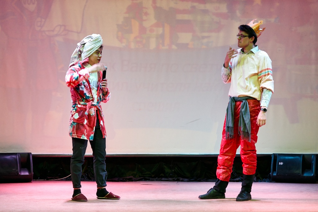 Благодаря инициативе студентов и их преподавателей, мы вновь услышали песни и стихотворения на английском, немецком, французском языках. Зажигательные танцы под мотивы востока, американские и европейские хиты не оставили равнодушными ни одного зрителя. Ребята не просто показывали свои номера, а еще погружались в сказочную атмосферу и вместе с Иваном-дураком искали в разных странах лучшего учителя. Конечно, нашелся такой педагог в России. В завершение концерта студенты факультета поздравили любимых преподавателей с наступающим праздником.