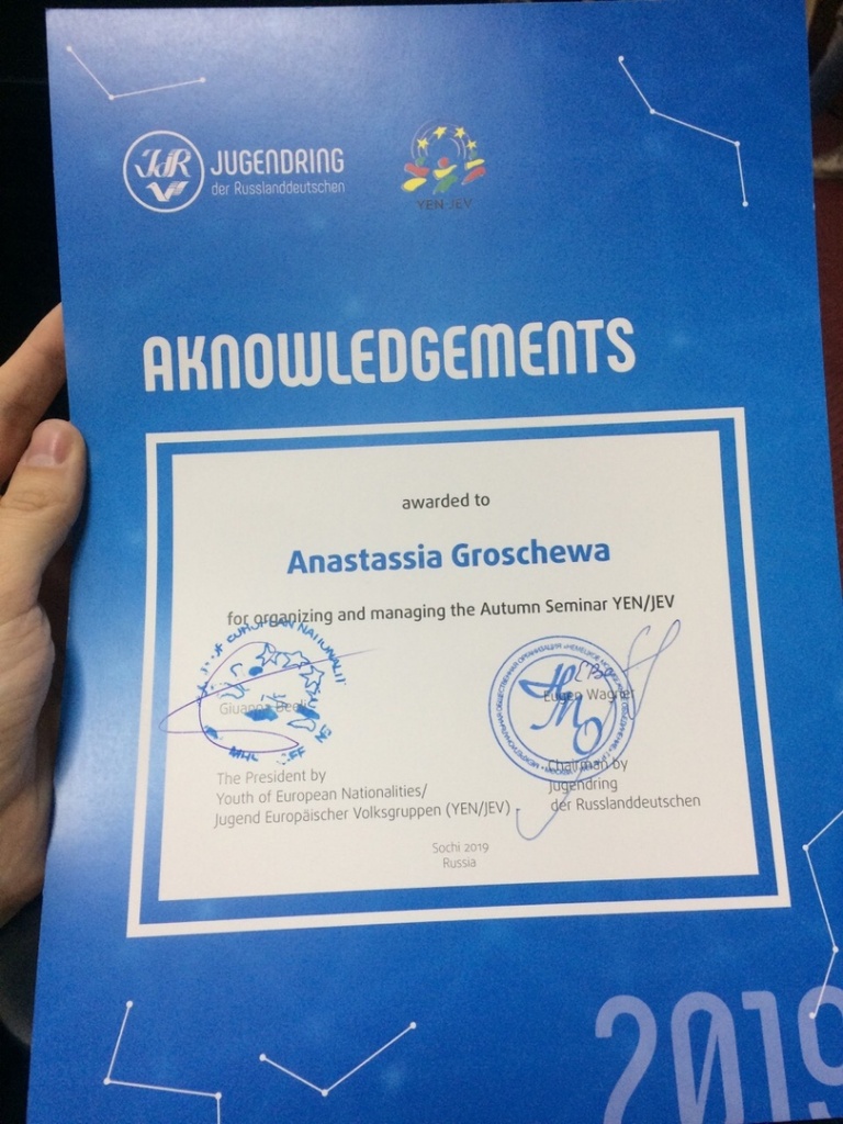 С 7 по 13 октября в прекрасном городе Сочи состоялся Международный осенний семинар молодежи народностей Европы «Gatherup», который объединил представителей различных национальностей из Албании, Австрии, Хорватии, Польши, Швейцарии и других стран Европы, а также участников из разных частей России. Этот проект направлен на расширение и укрепление международного взаимодействия между представителями молодежи разных национальностей России и Европы. Студентка 4 курса факультета филологии и массовых коммуникаций Анастасия Грошева приняла участие в этом проекте в качестве волонтера.
