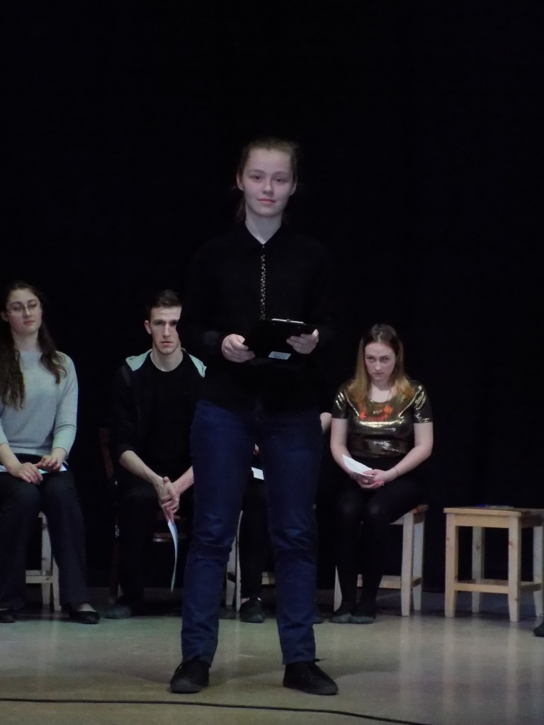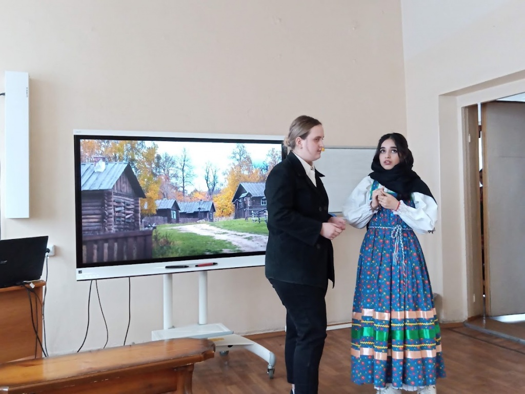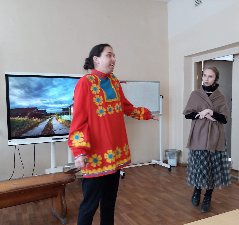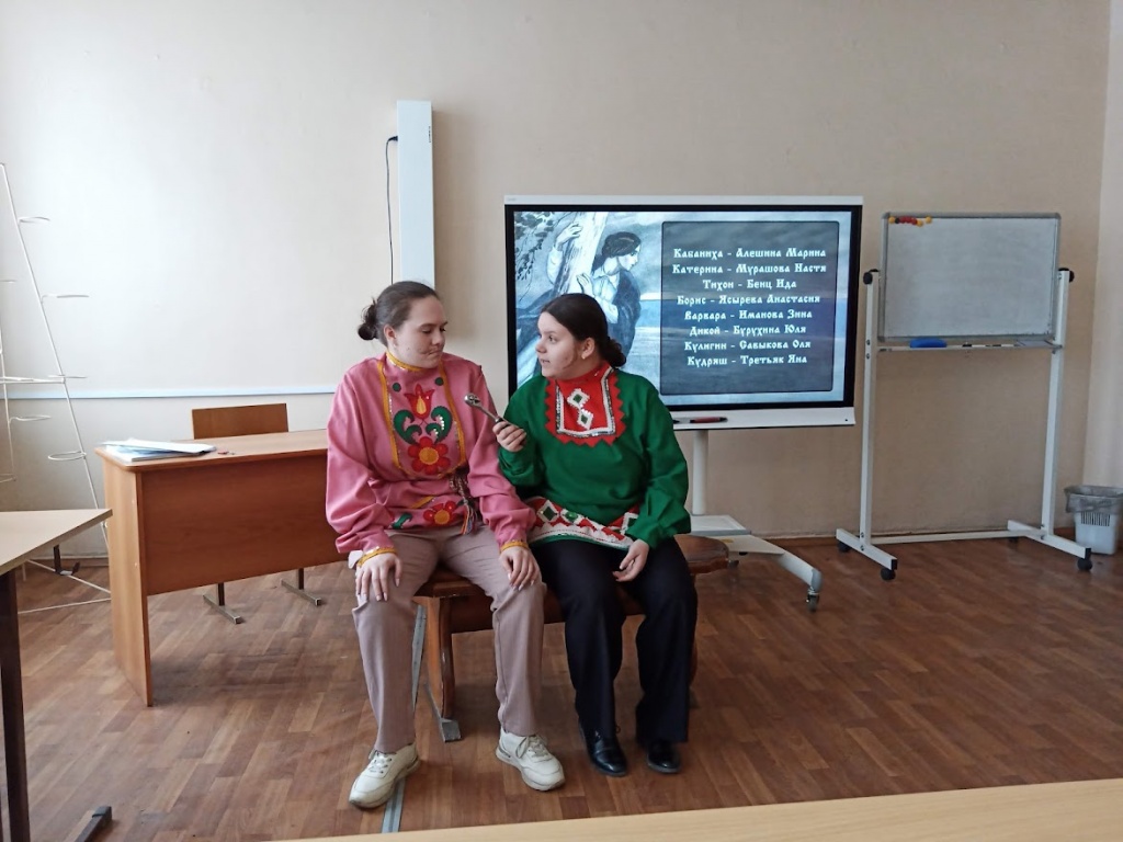 В дополнение к качественной презентации были показаны театральные постановки, специально подготовленные студентами для мероприятия. Студенты группы Нт-205о РЛТ представили свою версию «Грозы», сценарий которой – своеобразный дайджест пьесы – подготовила Екатерина Наймушина. Благодаря стараниям Екатерины драму удалось сжать, но при этом сохранить ее основное содержание, передать наиболее важные элементы сюжета. Подбор студентов на главные роли привел в восторг каждого, кто присутствовал на вечере. Больше всего оваций получила исполнительница главной роли – Анастасия Мурашова, сыгравшая Катерину Петровну. Харизматичными были и другие участники инсценировки, точно воссоздавшие характеры персонажей: жесткой Кабанихи (Марина Алешина), слабовольного Тихона (Ида Бенц), малодушного Бориса (Анастасия Ясырева), обаятельной, но принимающей законы «темного царства» Варвары (Зина Иманова), самодура Дикого (Юлия Бурухина), интеллигентного Кулигина (Ольга Савыкова) и задиристого Кудряша (Яна Третьяк). По словам зрителей, постановка смогла разбудить в них сильные чувства, вызвать сопереживание, несмотря на хрестоматийность самого произведения. Для большего вовлечения в историю все выступление сопровождалось качественной презентацией А. Ясыревой и музыкальными вставками, которые удачно подобрала Е. Наймушина.