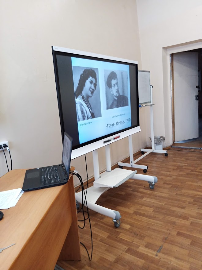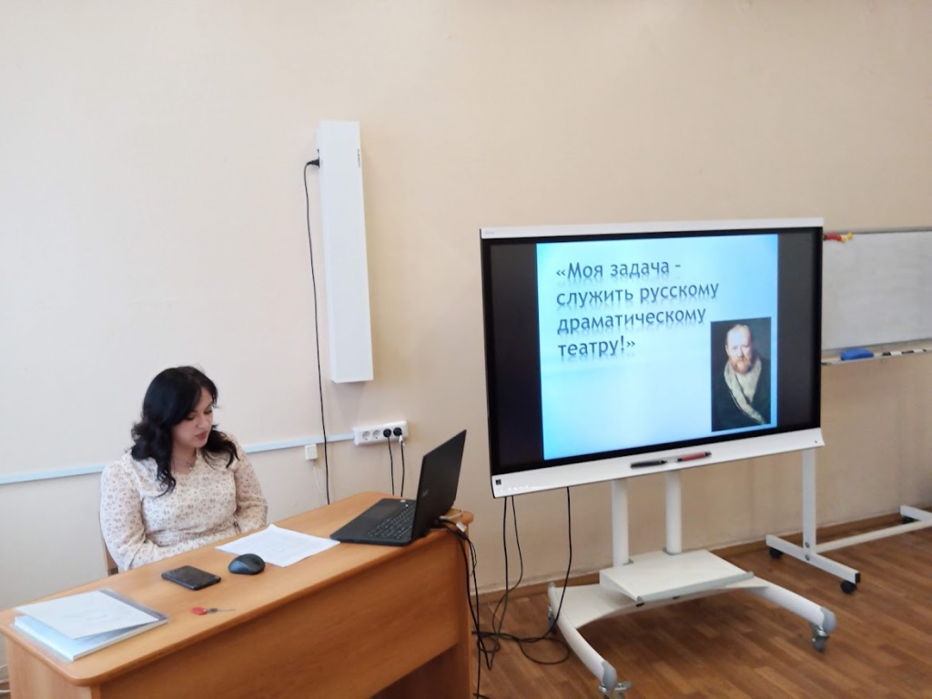 Александр Николаевич Островский, несомненно, внес огромный вклад в развитие драматургии и создание русского театра. Вечер начался с разговора о театральных и киноинтерпретациях самых популярных произведений драматурга – пьес «Гроза» и «Бесприданница». Юлия Шамова – студентка группы Нт-502о РЛТ – подготовила презентацию и сообщение о различных воплощениях драмы «Гроза»: от первой постановки 1859 года до киноверсии 2019 года и сценической версии Серовского театра 2022 года. Г. А. Авдеева дополняла рассказ Юлии интересными фактами, например, об истории создания пьесы «Гроза», которая была практически написана специально для Любови Косицкой и содержала фрагменты личных воспоминаний актрисы, включенные в монологи главной героини. Кроме того, Галина Анатольевна поделилась впечатлениями от некоторых интерпретаций драмы: рассказала о крайне спорной версии театра «Современник» 2006 года, критически оценила киноверсию 2019 года, а также дала высокую оценку оригинальной интерпретации Серовского театра 2022 года. Аналогичным образом Ю. Шамова представила информацию о театральных и экранных воплощениях пьесы «Бесприданница», уделив особое внимание популярной экранизации «Жестокий романс» (1984) и сценической версии Нижнетагильского драматического театра (2022), которая вызвала неоднозначную реакцию.