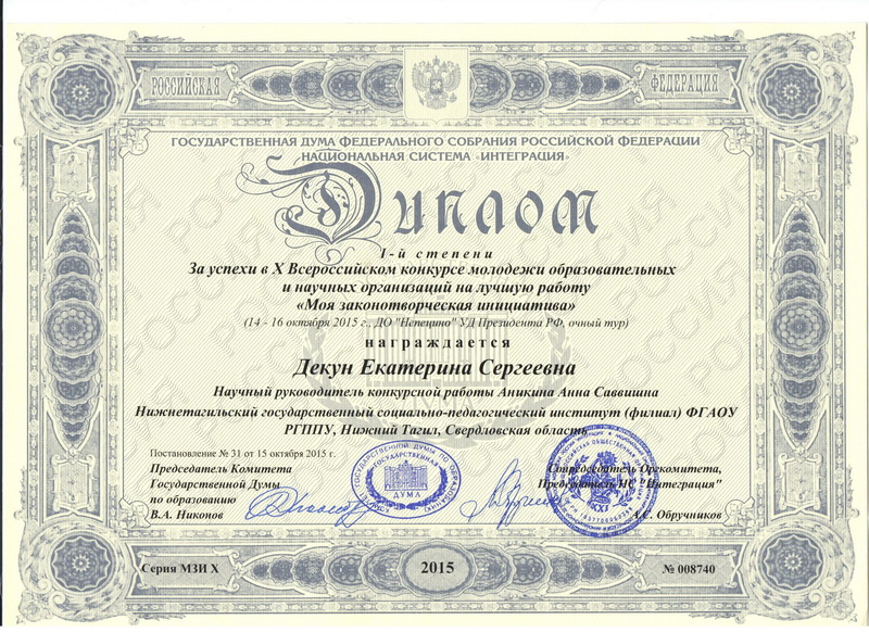 Все трое студентов нашего ВУЗа стали призерами конкурса и были награждены именными дипломами «За успехи во Всероссийском конкурсе молодежи образовательных и научных организаций на лучшую работу «Моя законотворческая инициатива»: дипломом 1-й степени – Екатерина Декун, дипломом 2-й степени – Александр Юрлов, дипломом 3-й степени – Анастасия Широкова.