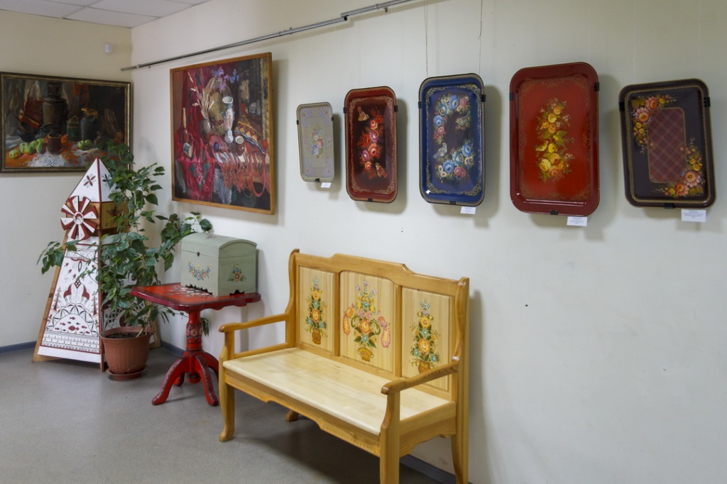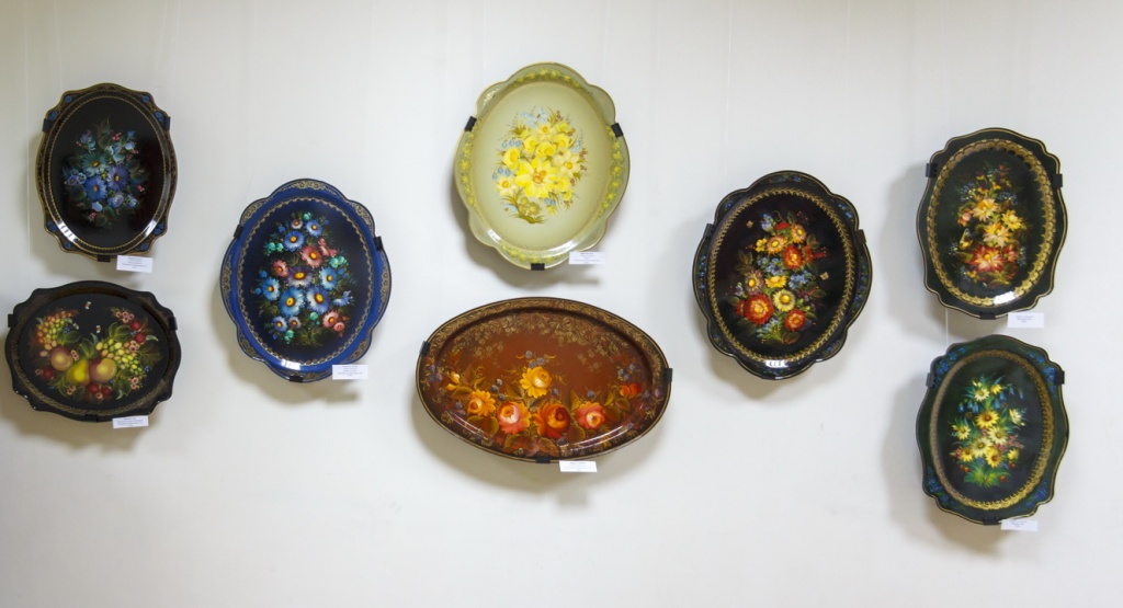 Представленные в экспозиции подносы и предметы домашнего быта выполнены по мотивам уральской росписи.