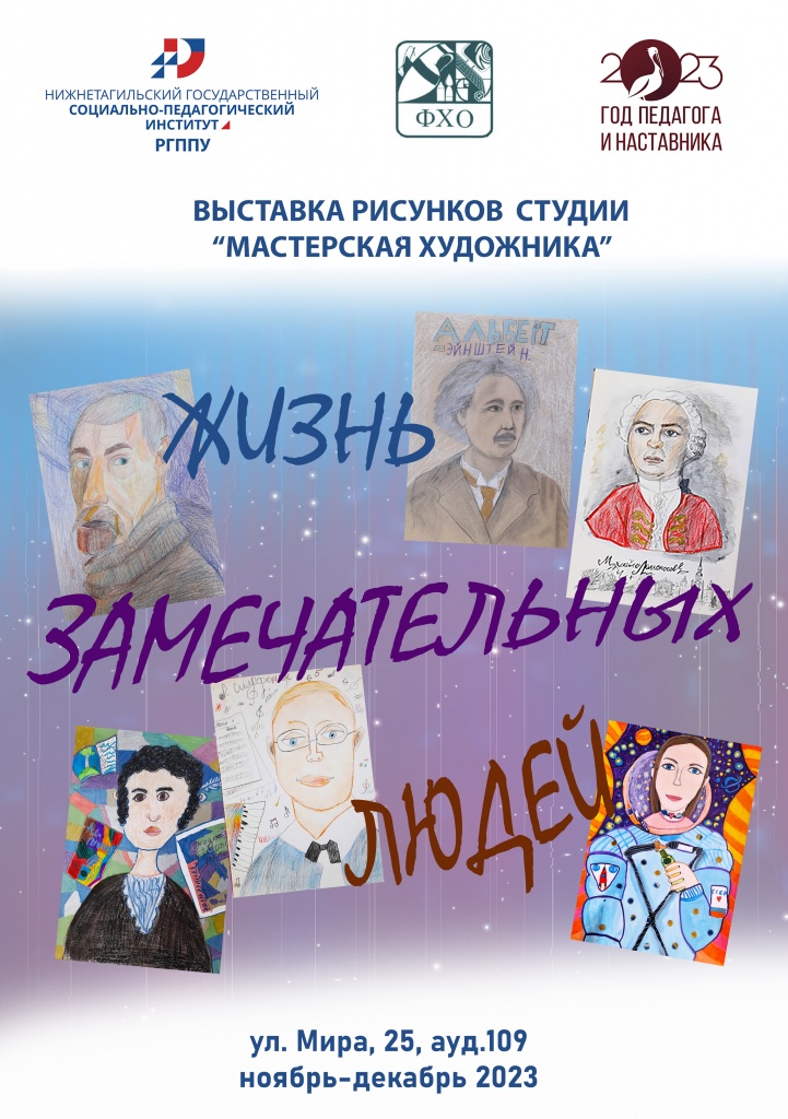 7 ноября на 1-м этаже (ауд.109) факультета художественного образования открылась выставка детского творчества. В экспозиции представлены детские рисунки, посвященные замечательным людям: ученым и художникам, писателям и поэтам, музыкантам и даже космонавтам. Портрет – сложная тема, но авторам из детской студии «Мастерская художника» удалось воплотить характеры выдающихся исторических личностей. Также здесь можно увидеть интерпретации известных картин великих художников и автопортреты детей, которые представляют себя великими художниками и артистами.