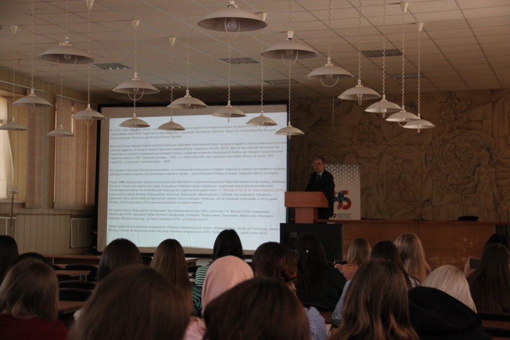 24 апреля доцент кафедры ГСЭН, кандидат исторических наук В. Ф. Мезенцев прочитал лекцию на тему «Великая Отечественная война в исторической памяти российского общества». Лекция стала анализом восприятия ключевых событий войны сквозь призму общественного мнения.