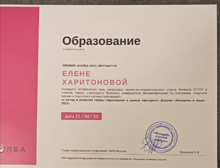 В середине марта этого года стало известно о том, что начальник научно-исследовательского отдела филиала РГППУ в г. Нижнем Тагиле стала победителем Первой Национальной Премии для женщин-ученых и специалистов KOLBA. Елена Геннадьевна Харитонова победила в номинации «Образование» https://www.ntspi.ru/about_academy/academy_news/70971/ .
