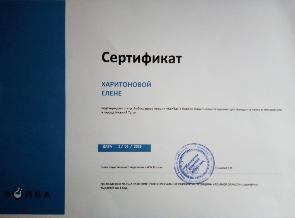 Напомним, после вручения Первой национальной премии для женщин-ученых и специалистов Kolba в апреле 2023 г. Координационным советом Фонда «Женщины атомной отрасли» WiN Russia было принято решение создать должность представителя Премии Kolba в регионах. Первый амбассадор Премии появился в апреле в Бурятии – им стала кандидат биологических наук, член Союза машиностроителей России Анастасия Пержакова (г. Улан-Удэ). С 1 мая амбассадором Первой национальной премии для женщин-ученых и специалистов Kolba в г. Нижнем Тагиле стала кандидат исторических наук, начальник отдела НИР НТГСПИ Елена Харитонова. В данный момент, завершается официальное оформление третьего амбассадора Премии Kolba – в Республике Башкортостан.