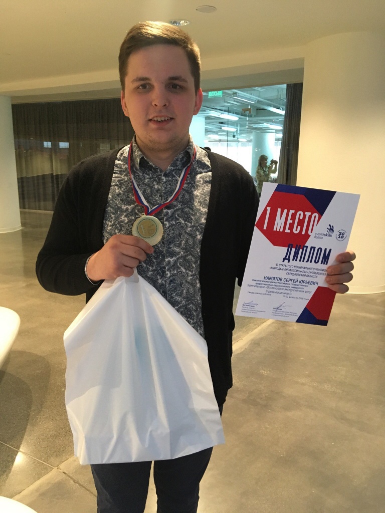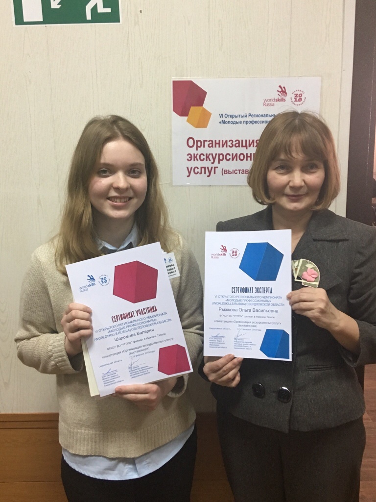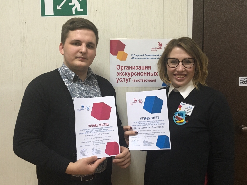 21 декабря 2018 г. в «Ельцин-центре» (г. Екатеринбург) были подведены итоги регионального чемпионата «Молодые профессионалы» (WORLDSKILLS RUSSIA). В компетенции «Организация экскурсионных услуг» победил студент 3 курса социально-гуманитарного факультета Сергей Намятов (эксперт-компатриот Ирина Викторовна Даренская). Второе место заняла студентка 2 курса СГФ Валерия Шаромова (эксперт-компатриот Ольга Васильевна Рыжкова).