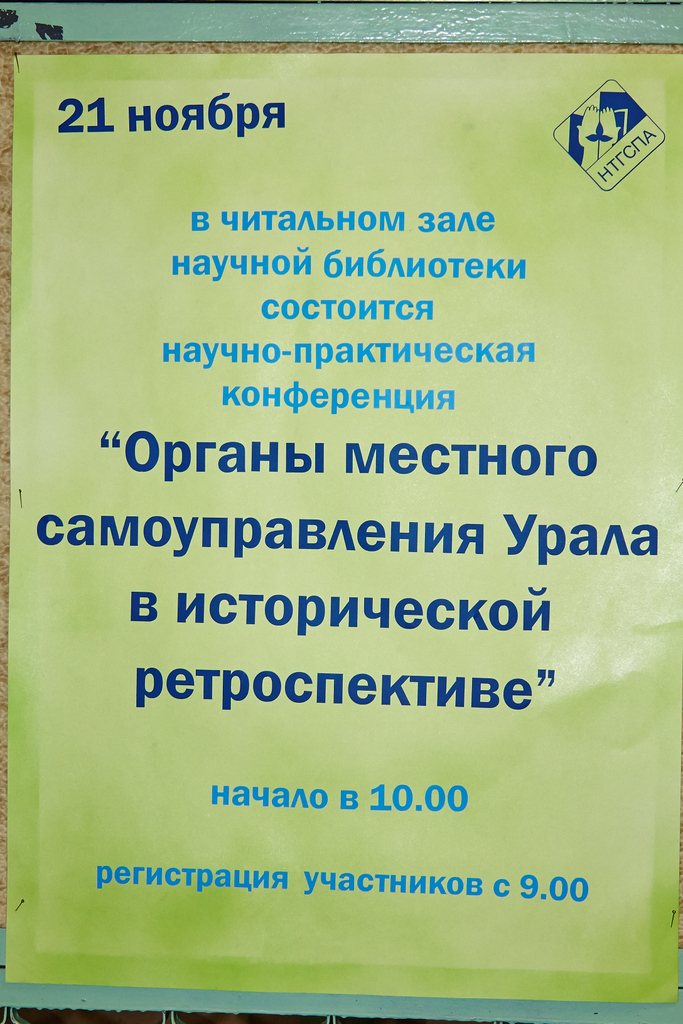 21 ноября 2013 года на базе Социально-гуманитарного факультета НТГСПА состоялась научно-практическая конференция «Органы местного самоуправления Урала в исторической ретроспективе». Инициатором мероприятия выступило Управление по делам архивов Свердловской области.