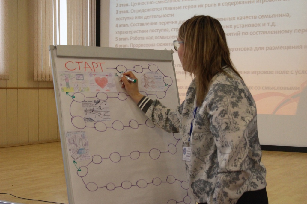 Следующим форматом семинара стала мастерская по игропрактике «Формирование ценностного отношения к семье в условиях настольно-образовательных авторских игр игрового комплекса „Наследие”». Участники семинра создавали коллективную игру «Семейные традиции», разработанную Еленой Николаевной Бородиной, кандидатом педагогических наук, доцентом Уральского государственного педагогического университета.