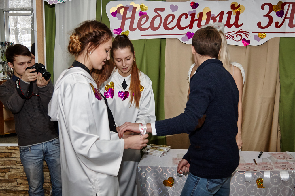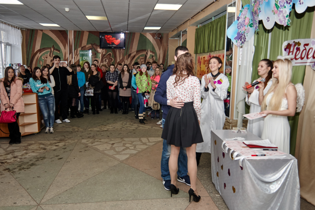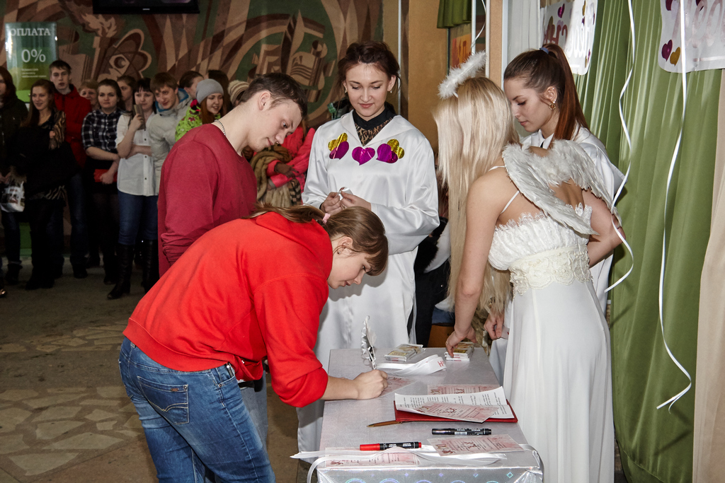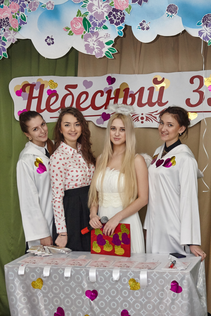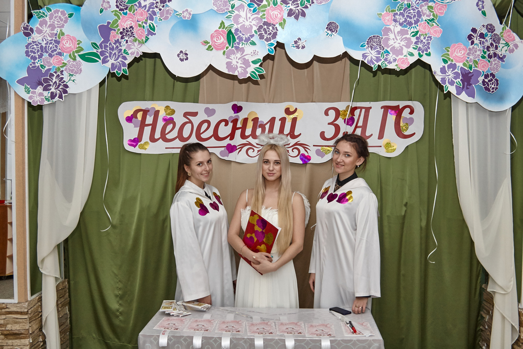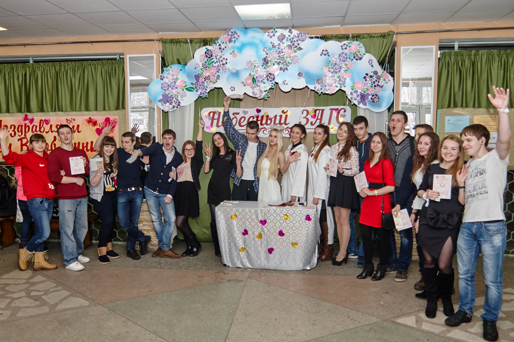 13 февраля в преддверии праздника Дня Святого Валентина в нашем вузе работал загс, в котором влюбленные пары имели возможность зарегистрировать свои отношения. В этот день восемь счастливых пар узаконили на один день свои отношения в импровизированном небесном загсе. Небесный ангел вручил парам свидетельства о заключении брака. Для них прозвучал марш Мендельсона.