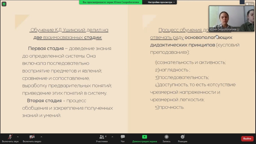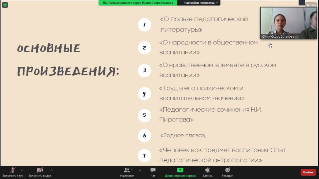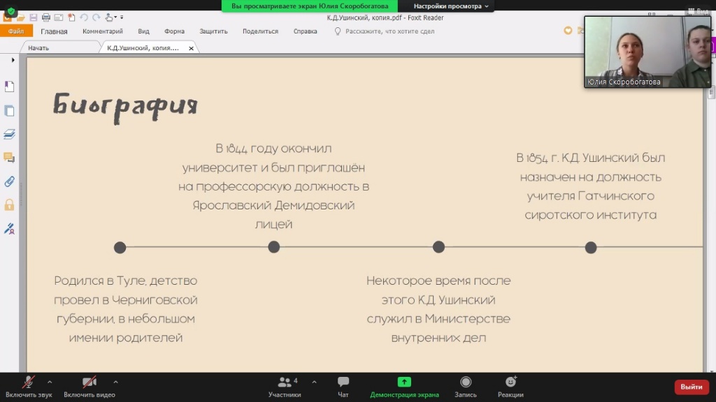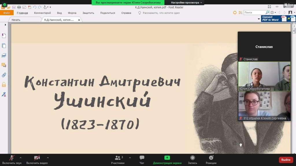 Началась встреча с рассказа об известном педагоге Константине Дмитриевиче Ушинском. Участники конференции ознакомились с его биографией, произведениями и выделяемыми им принципами обучения.