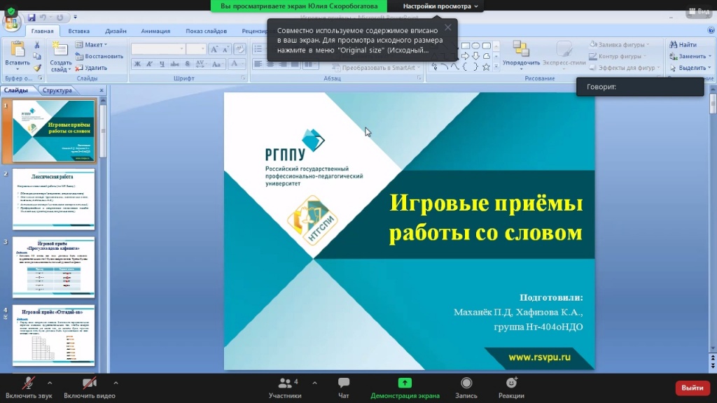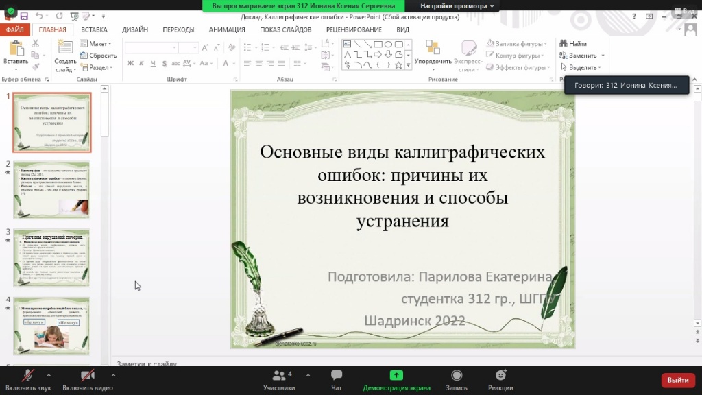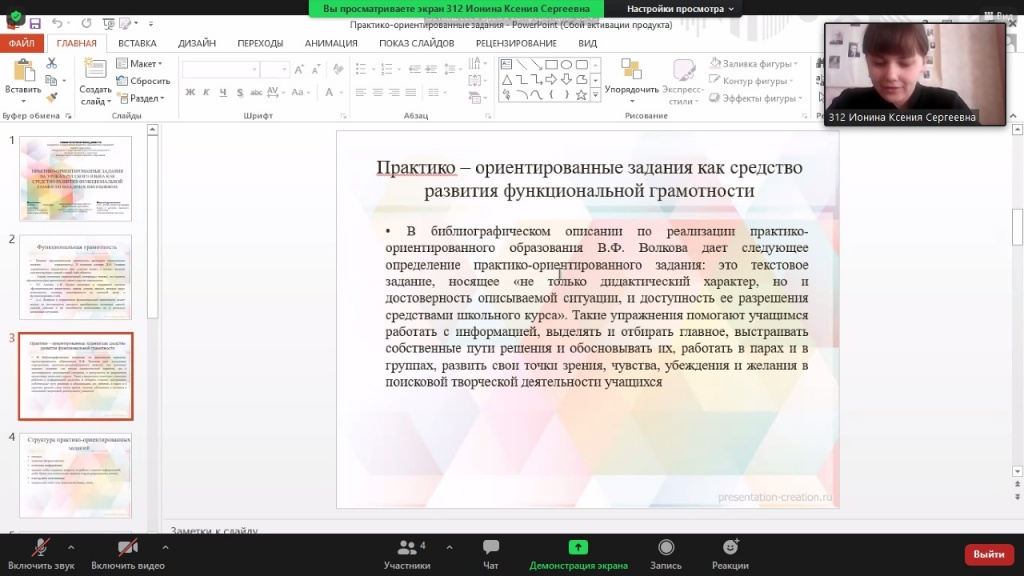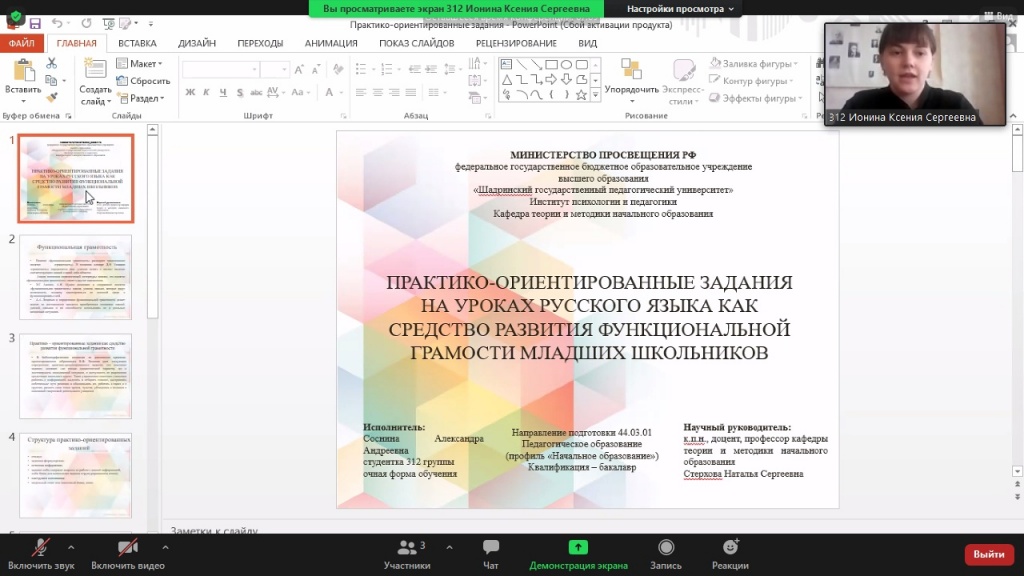 Александра Соснина (3 курс ШГПУ) поведала нам о практико-ориентированных заданиях русского языка как средствах развития функциональной грамотности младших школьников. Речь шла о текстовых заданиях, носящих не только дидактический характер, но и достоверность описываемой ситуации, доступность ее разрешения средствами школьного курса. Такие упражнения помогают работать с информацией, успешно выделяя главное.
