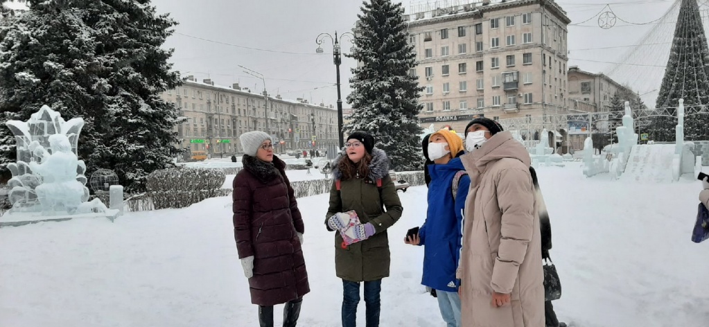 Нижний Тагил встретил иностранных гостей уральскими морозами. Но это не помешало первым прибывшим конкурсантам – Синь Янань, Кадрекову Шорасулу, Козачковой Юлии и Нижник Ирине – принять участие в пешеходной экскурсии по городу. В качестве экскурсовода выступила Арина Догадина – студентка 5 курса ФФМК. Но ей активно помогали преподаватели кафедры ИЯРФ. Гостей провели по центру города, показали театральную площадь, на которой уже началось строительство снежного городка; музей под открытым небом около краеведческого музея и другие достопримечательности.