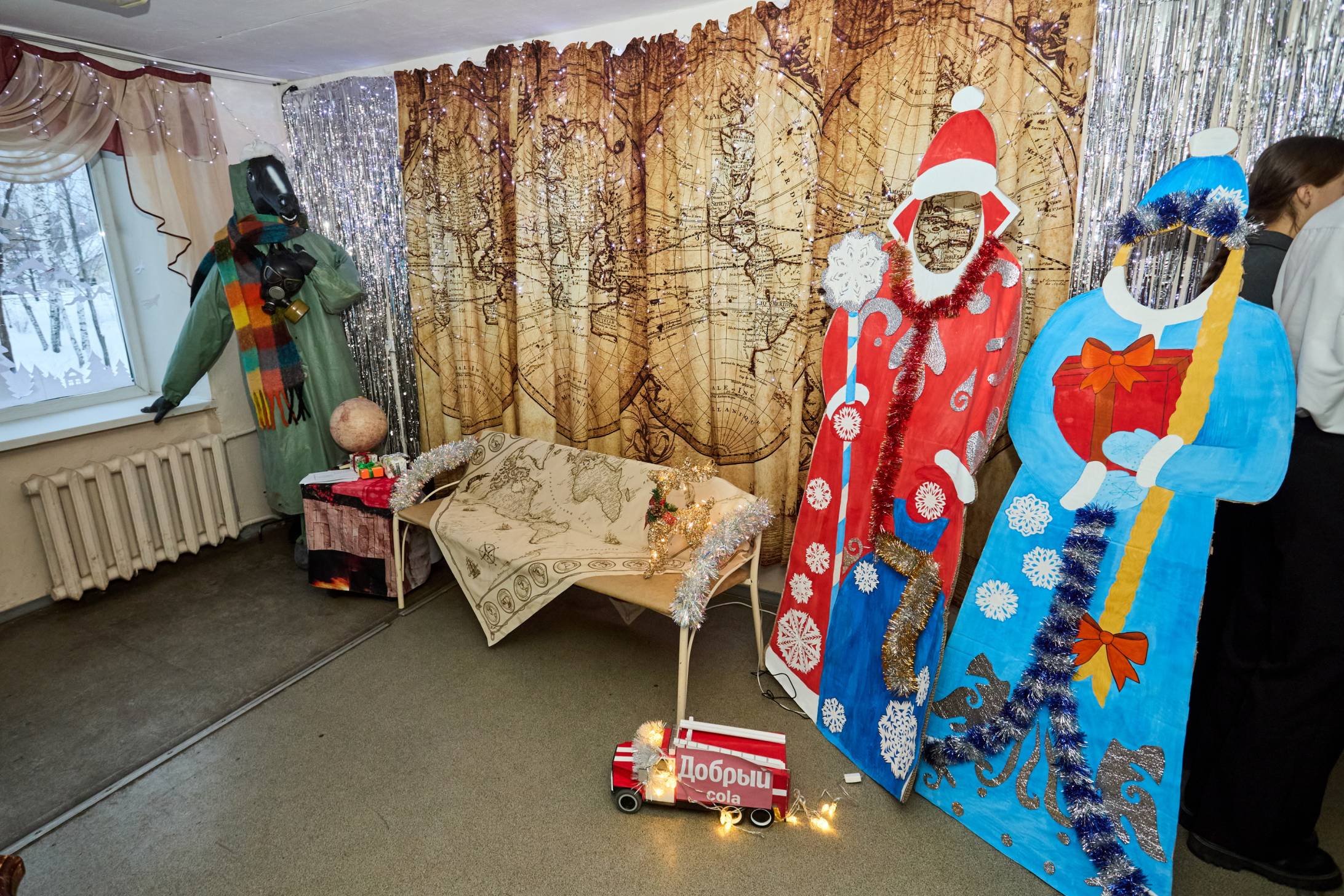 На ФФМК Новый год – это обязательные пожелания на английском, русском и немецком языках, яркая фотозона, рядом с которой прогуливаются на переменах сам Мороз и его внучка Снегурочка.