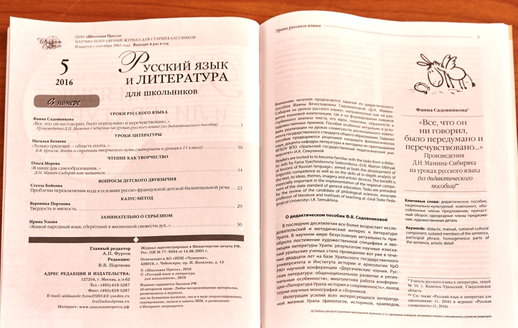 Журнал выходит с двумя приложениями: научно-популярным журналом для старшеклассников «Русский язык и литература для школьников» и электронным периодическим изданием «Русская словесность» (№ 5, 2016), включающим научные исследования по творчеству Мамина-Сибиряка, рассказы писателя («Последняя треба» – один из самых известных дореволюционных рассказов Дмитрия Наркисовича, посвященный памяти Марии Францевны Абрамовой), документальный фильм «Мамина дочка», обзор лучших творческих работ лауреатов конкурса «Серая шейка».