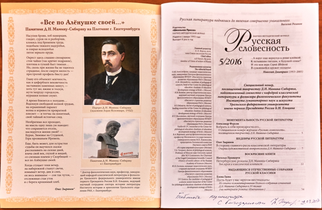 Научная библиотека НТГСПИ получила в дар от председателя Нижнетагильского городского совета Всероссийского общества изобретателей и рационализаторов и идейного вдохновителя проекта «Серая шейка» Юрия Даниловича Исупова пятый номер научно-методического журнала «Русская словесность» за 2016 год. Издание, посвященное творчеству Д. Н. Мамина-Сибиряка, подготовлено совместно с кафедрой классической литературы и фольклора Института гуманитарных наук и искусств Уральского федерального университета им. Б. Н. Ельцина.