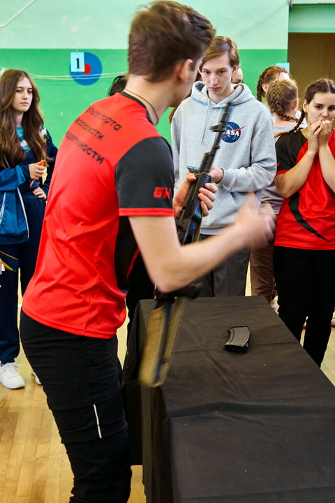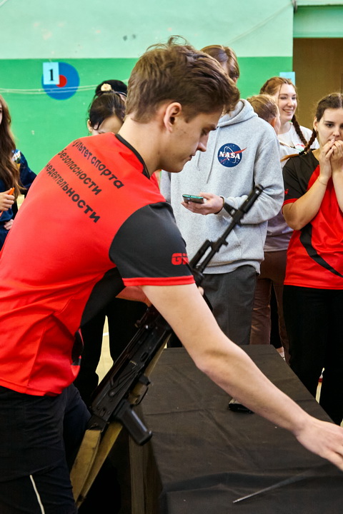 В это же время начался второй этап – «Сборка – разборка автомата Калашникова». Командиры команд выполняют задание «Трудное положение», и в это же время представитель от каждой команды проходит в тир и принимает участие в конкурсе «Меткий стрелок».