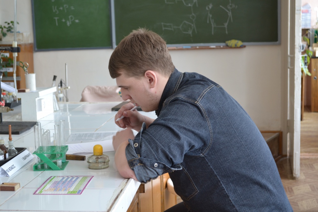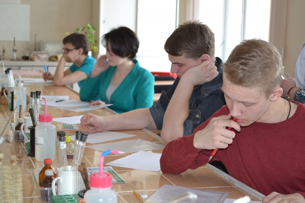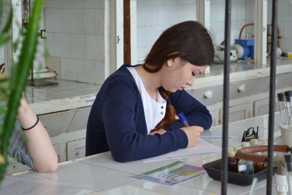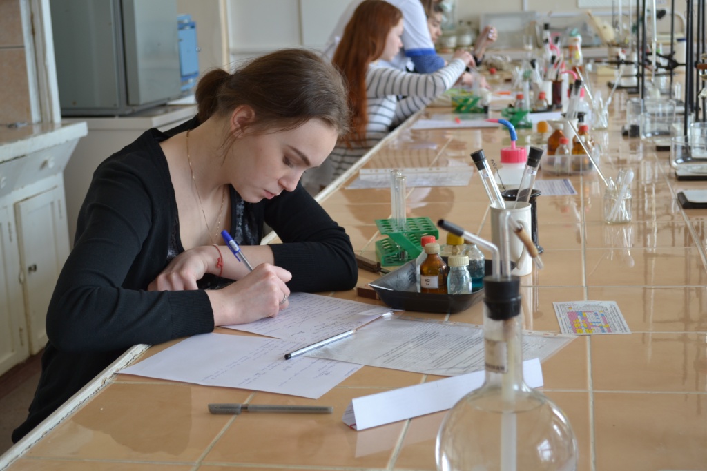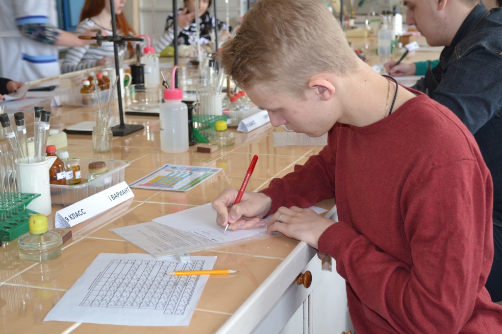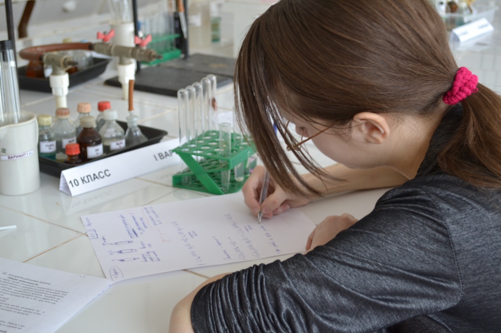 В рамках олимпиады по химии школьникам были предложены два тура – теоретический и практический. На первом этапе проверялись теоретические знания по неорганической и органической химии для учащихся 9–11 классов соответственно. От участников требовалось написать уравнения реакций, указать признаки проводимых химических реакций и дать названия продуктов реакций. Для прохождения на 2 этап учащимся необходимо было набрать 50 % от возможных максимальных баллов.